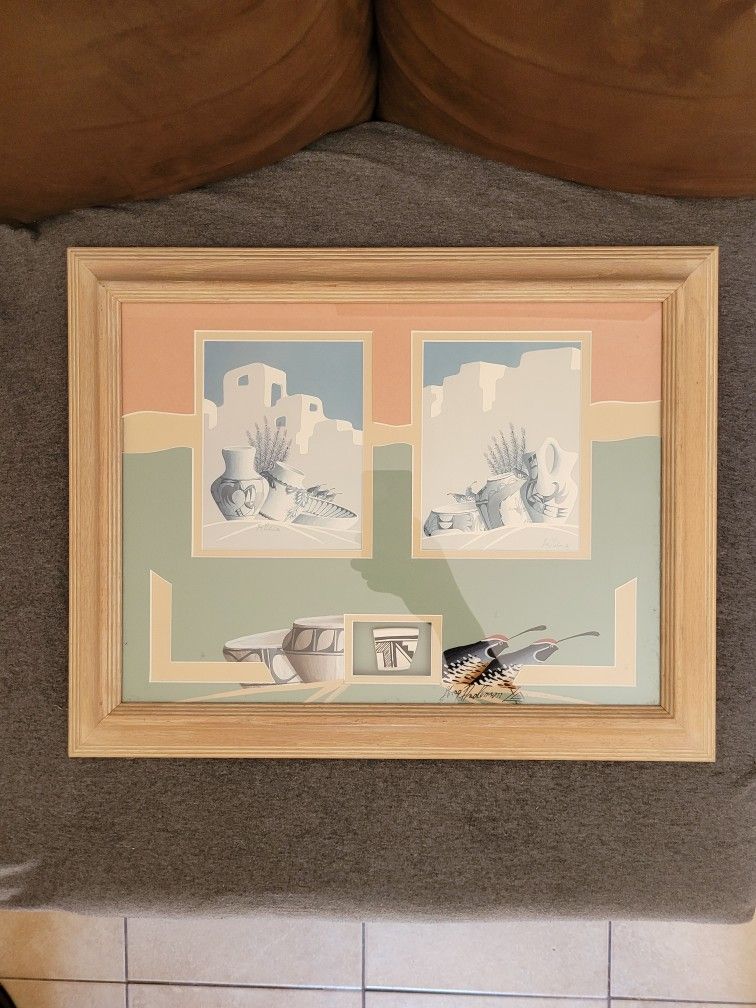 The product is a medium-sized original artwork by artist Greg Anderson, born and raised in Tucson, AZ, featuring a landscape theme in a realism style. It is signed by the artist, matted and framed, making it a one-of a kind piece of art. The fine art print is used but in very good condition, adding to its unique character as it is a finished and ready to hang work of art