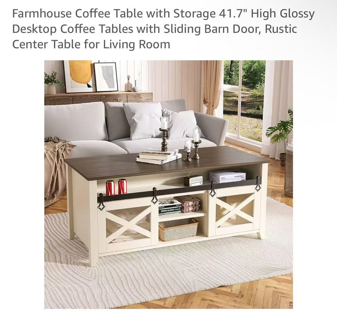 Farmhouse Coffee Table with Storage 41.7" High Glossy Desktop Coffee Tables with Sliding Barn Door