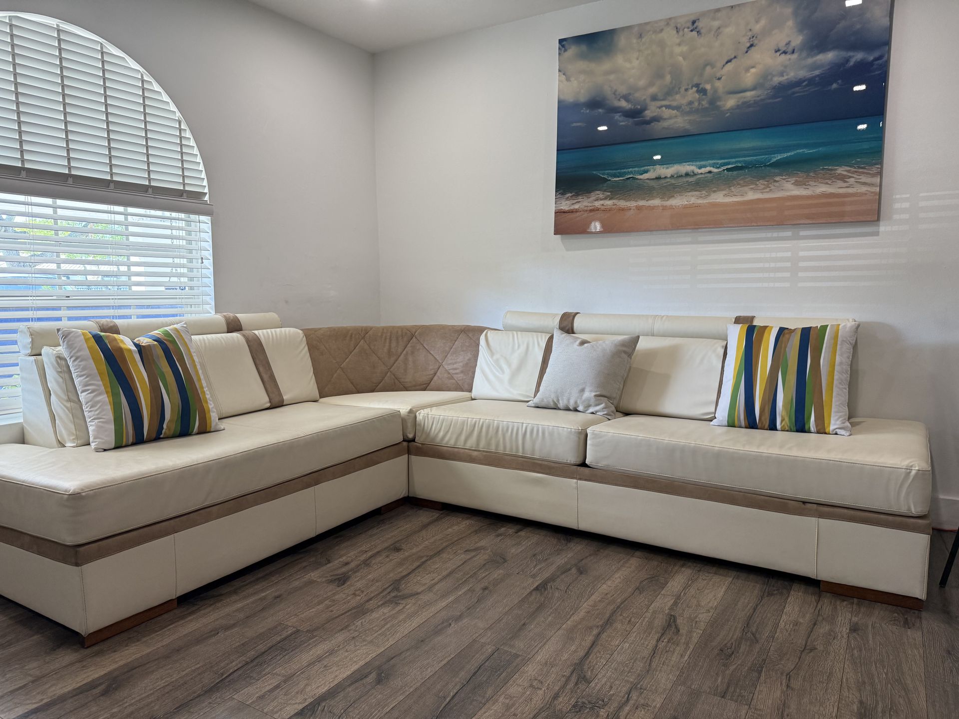 sectional sofa in great condition. Clean and well maintained. Beige sectional couch. Very high quality materials, this will last you a lifetime. Dimensions: • Left side: 98” • Right side: 117” • Depth: 37” • Seat height: 19” Recently cleaned and conditioned Pull-out bed works well and is ready to use Includes only the 2 colorful striped pillows shown in photos (other pillows not included) Delivery available for extra fee (depending on distance) Message me if interested – available as long as the listing is up.