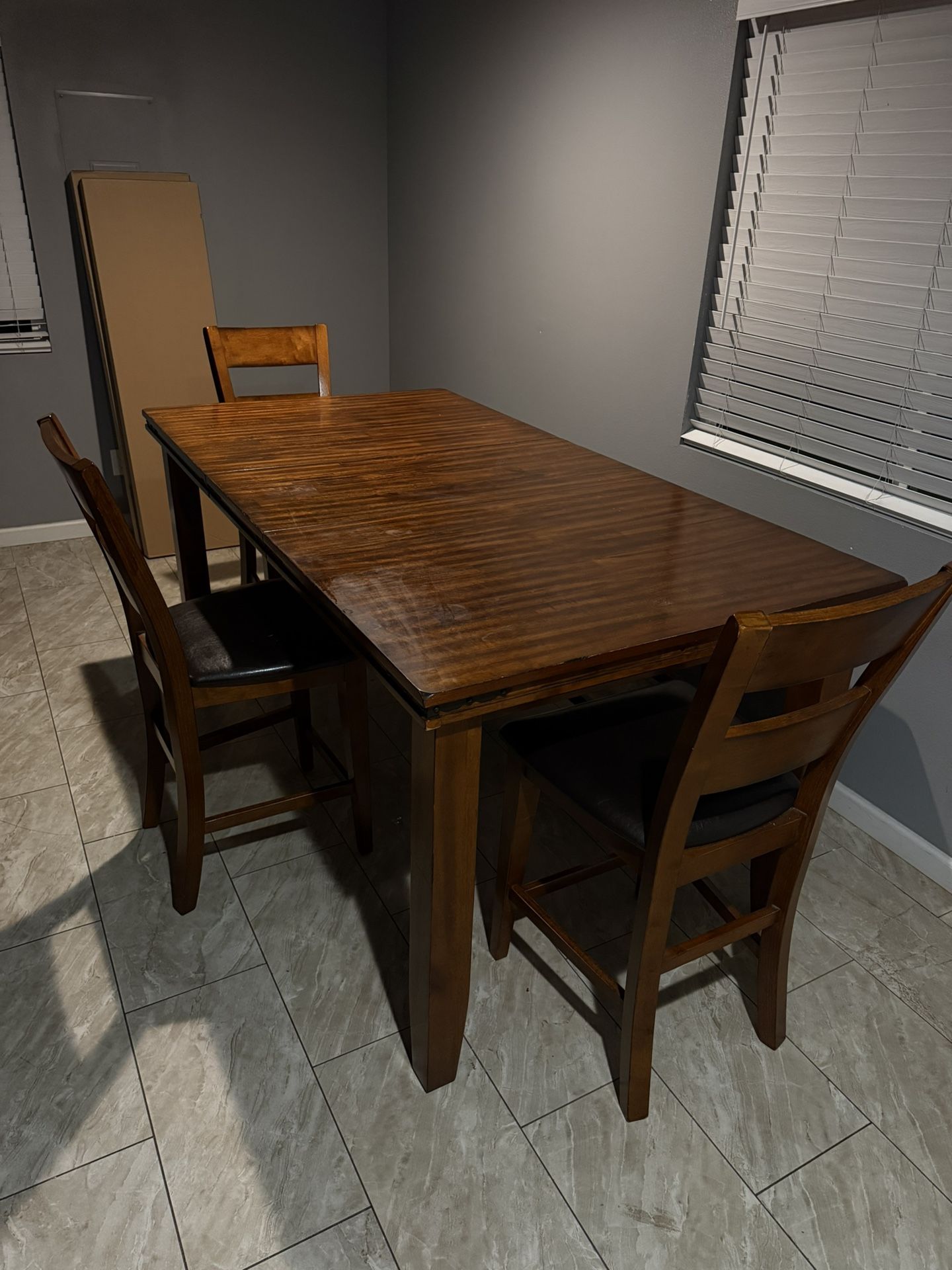 Beautiful, heavy, and extremely sturdy dining table set for sale. This set includes: • Rectangular wood dining table • Removable center leaf (can be used extended or smaller for everyday use) • 3 matching chairs • 1 padded bench The table features a rich warm wood finish with thick square legs, giving it a strong modern farmhouse feel. This is not a lightweight piece — it is solid and built to last. Very stable with no wobbling. The removable center leaf makes it versatile. Keep it compact for daily meals or extend it when hosting guests or family gatherings. The padded black bench slides neatly underneath the table to save space. Chairs are sturdy and comfortable. Condition: Good overall condition with normal surface wear on the tabletop consistent with use (see photos). Perfect for: • Family dining rooms • Apartments • Kitchen breakfast areas • Hosting holidays Please note: This set is heavy and will require at least two people for pickup. Message me if interested. Must pick up.