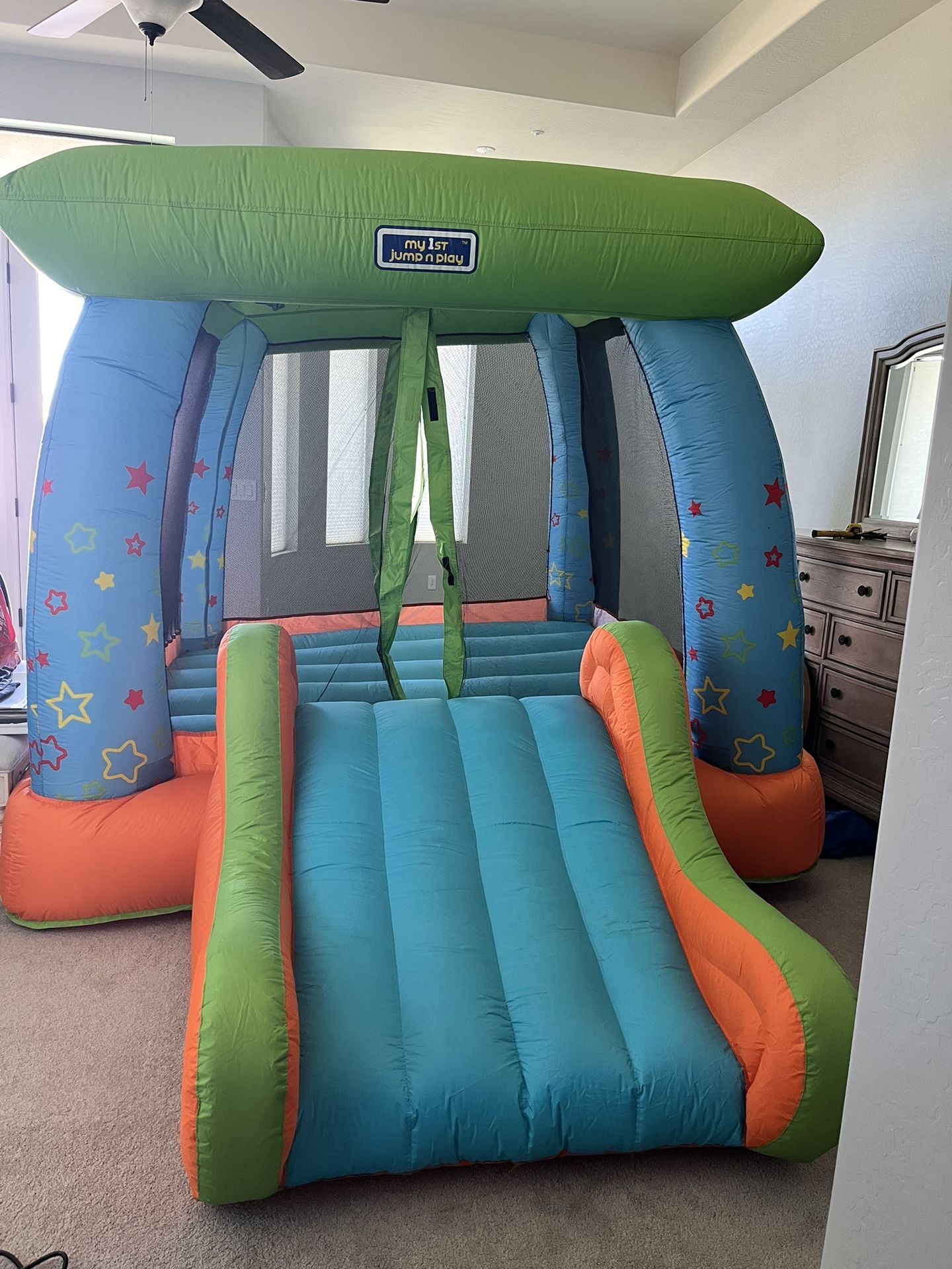 Good used condition. There is a tare at the hoop, but could easily be sewn, but it also doesn’t affect the bounce house at all! Comes with storage bag, blower, stakes to hold bounce house in place. Age range I think would be 8 and under
