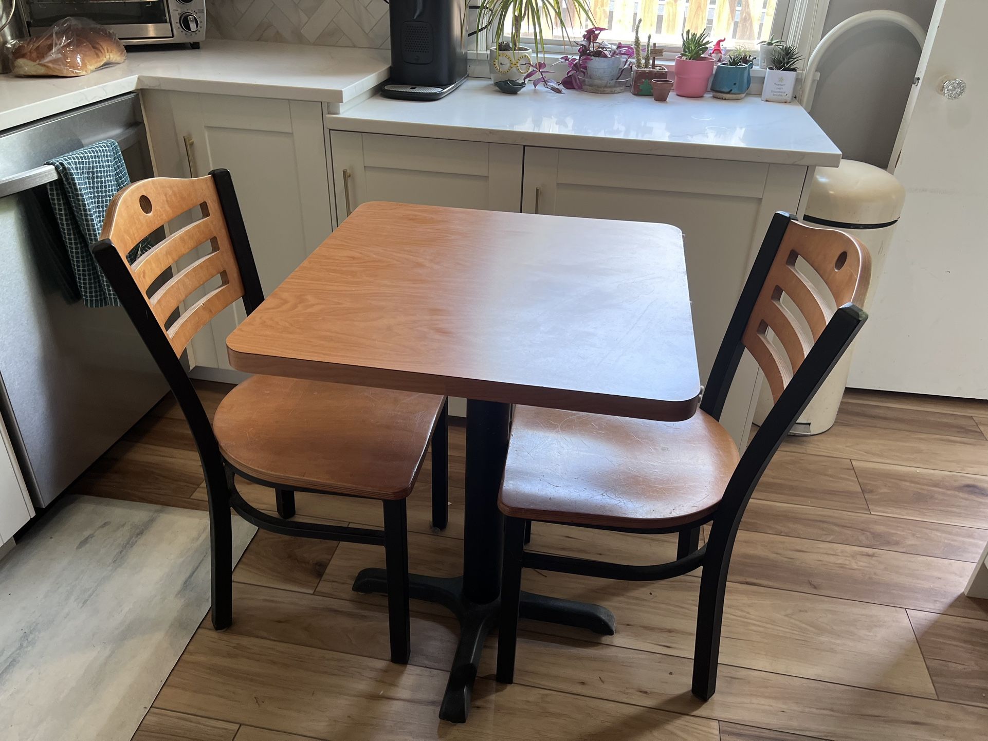 Tabletop- 24” x 24” x 29.5”h- laminate and metal Two chairs wood seats and back and metal