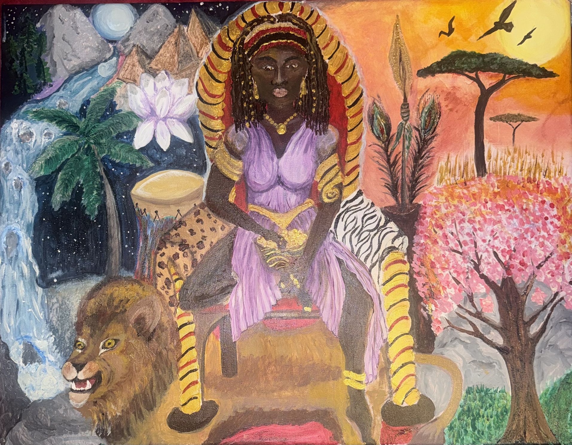 Original Acrylic Painting - 24x30 Canvas Stunning original artwork featuring a regal African queen enthroned between two worlds. This vibrant 24x30 acrylic painting showcases a powerful female figure adorned in purple and gold, seated majestically with a lion companion at her side. The composition is split between contrasting landscapes: the left side features a mystical nighttime scene with pyramids, waterfalls, lotus blossoms, and lush jungle foliage under a starry sky, while the right side bursts with warm sunset hues over an African savanna with acacia trees and cherry blossoms. Rich symbolic imagery includes animal print textiles (leopard and zebra), traditional drums, golden jewelry, and ceremonial headdress. The bold color palette combines deep purples, golds, oranges, pinks, and teals. Perfect for collectors of Afrocentric art, lovers of bold symbolic imagery, or anyone seeking a powerful statement piece. This one-of-a-kind painting celebrates strength, heritage, and the harmony between different worlds. Details: • Size: 24” x 30” • Medium: Acrylic on canvas • Original artwork (not a print) • Ready to hang or frame • Signed by artist