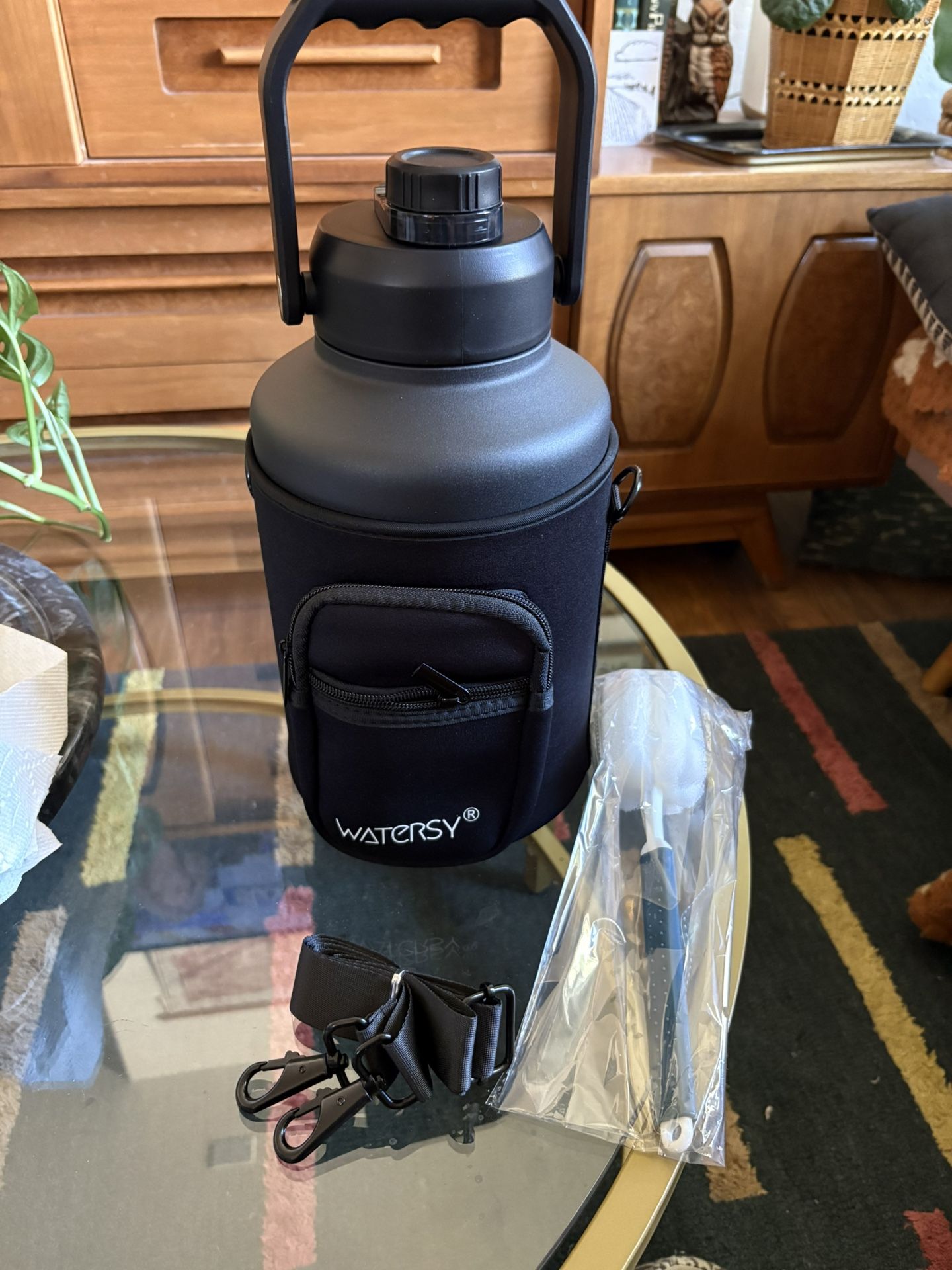 Huge WATERSY 128oz/1 gallon black water bottle/jug. Comes with a neoprene sleeve that has 2 zippered pockets. It also has a detachable shoulder strap and a brand new cleaning brush still in its package.. if interested please respond to this posting or text 602918three599. I’m in Peoria.