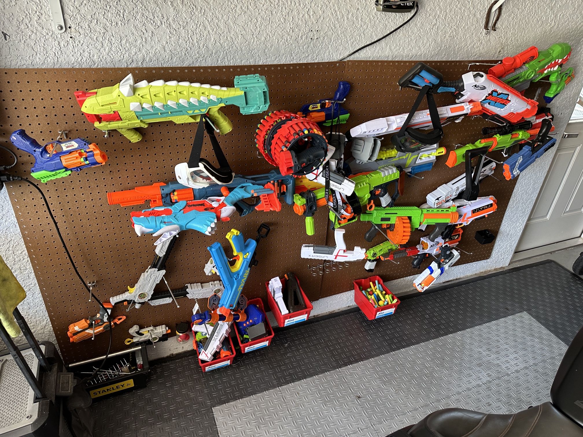 My Kids are selling their Nerf Arsenal! Everything what is shown on the Picture (Guns, Protection shields, Target, Bullets, Equipment, Hangers, Wall…) Comes also with 4 Laserguns