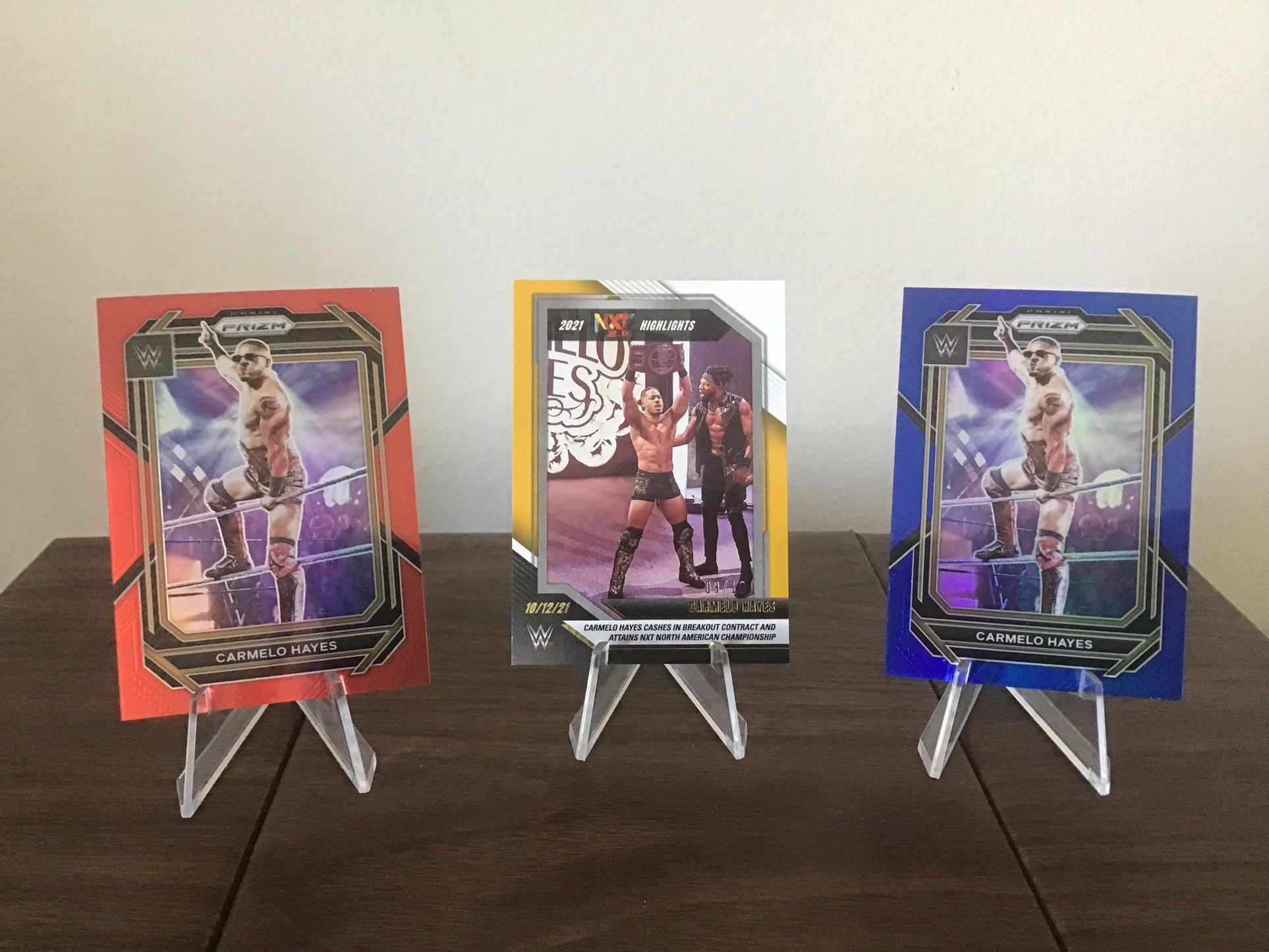 A set of 3 2022-23 Carmelo Hayes WWE NXT Panini Numbered #/# Trading Cards. 2 Prizm and 1 highlight. 2023 Panini Prizm RED 298/299 #191 2023 Panini Prizm BLUE 144/199 #191 2022 Panini 2021 highlights 9/10! #30 The lot of 3 Carmelo Hayes cards goes for $10 total. Located at beach and terry in Huntington Beach.