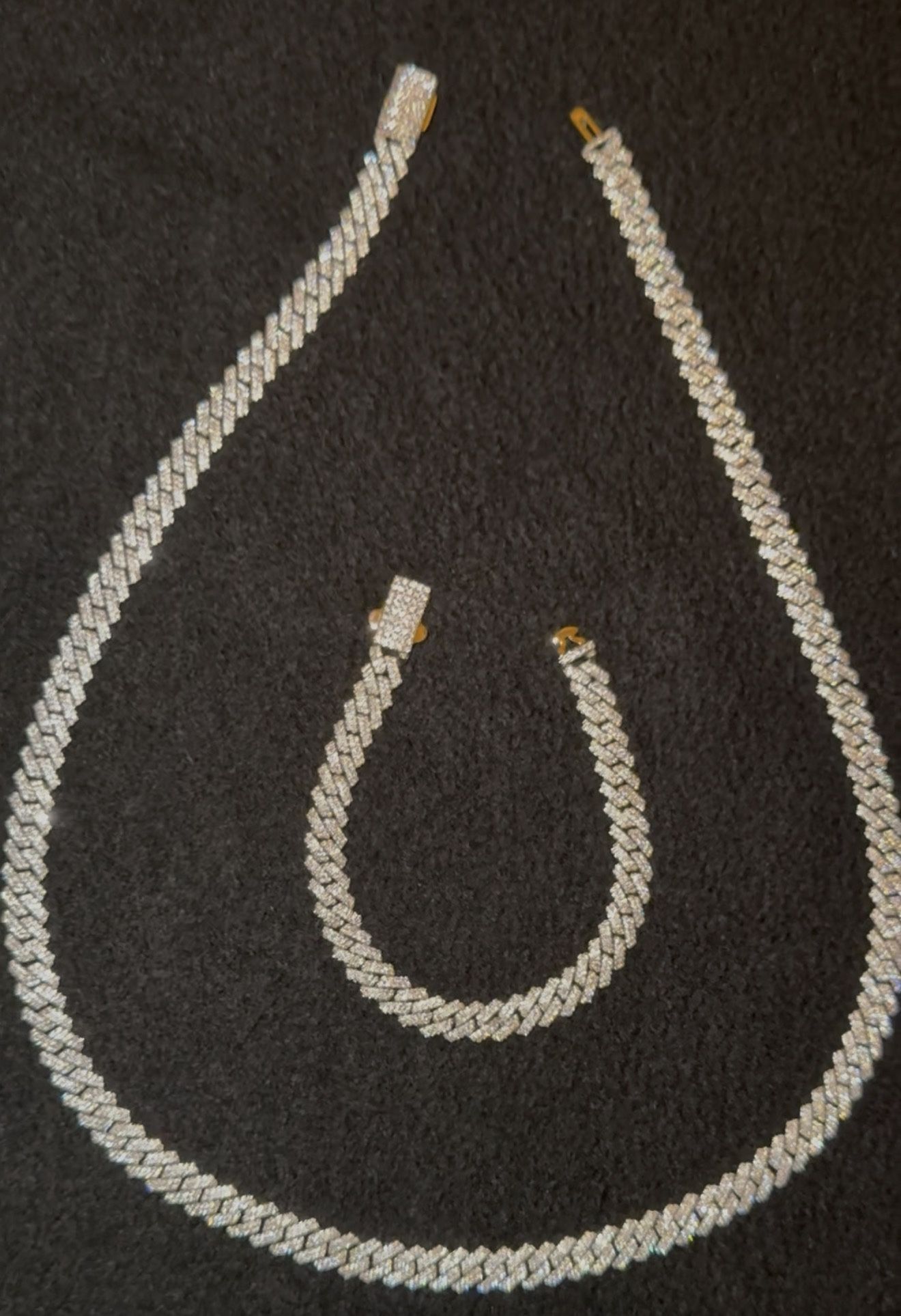 Have three sets Tenis , Cuban and crosses Tenis 5mm chain 22”+ cross 2” size+ bracelet 8” Cuban 8mm chain 22” + bracelet 8” Crosses 9mm 22” + bracelet 8” All in 14k gold 5x electroplated over 926 solid silver, Vvs flawless pointers, crazy shine! Turn heads with this stunning set , for a steal black friday price! (Usually $1000- $1200) Yours for only $450 any set Please serious inquires only Ready for pickup (police department meetup). Fee free to ask for detailed vids
