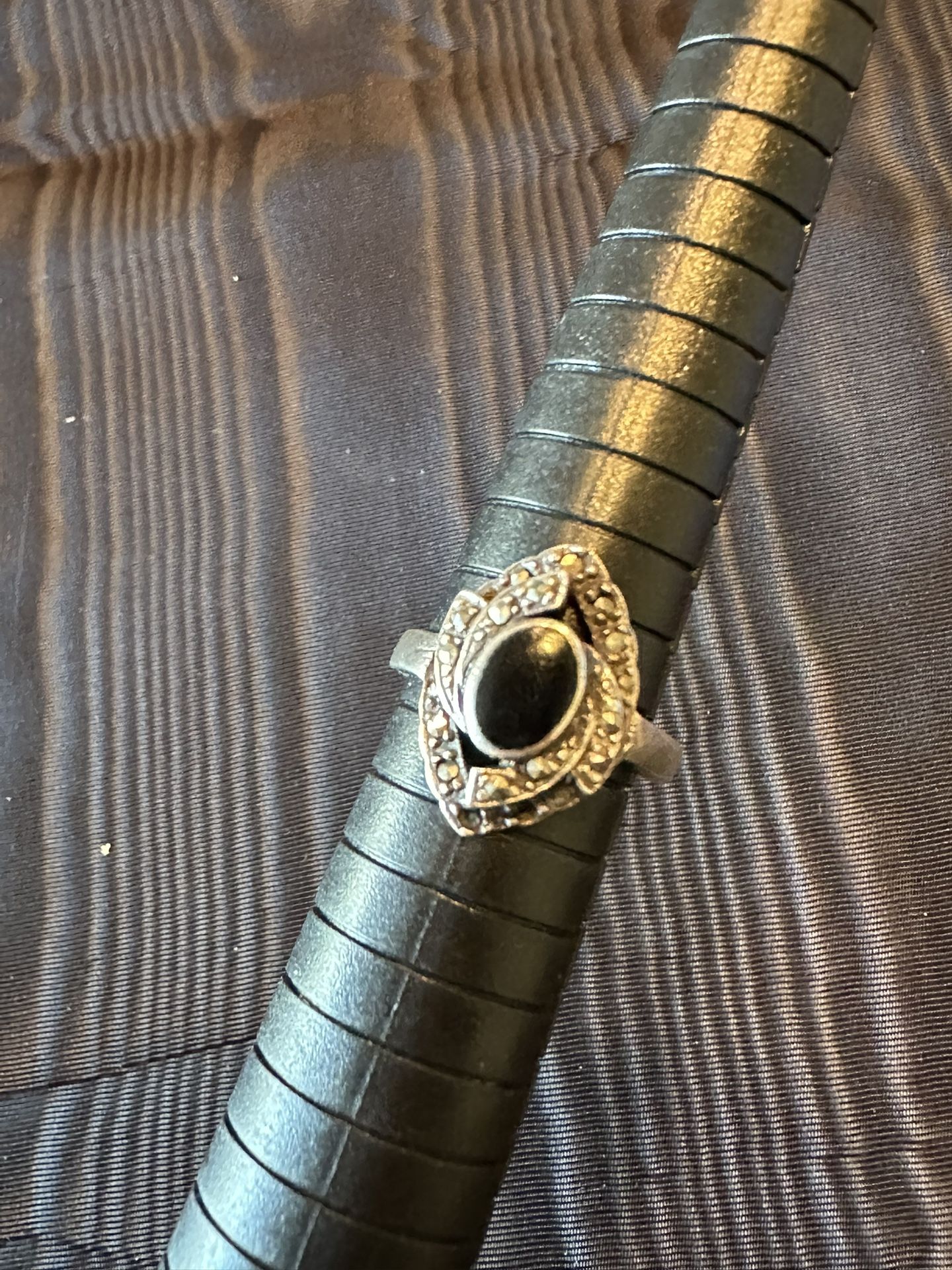 $35 OBO – Pickup in Whittier Beautiful vintage-inspired ring with a polished black stone centerpiece and sparkling marcasite accents. Stamped 925 for sterling silver. Size 7. Eye-catching yet elegant, perfect for everyday wear or special occasions. Condition: Gently worn, no missing stones Material: Sterling silver (925), black onyx-style stone Style: Art Deco / Vintage Message me if interested. Open to offers!
