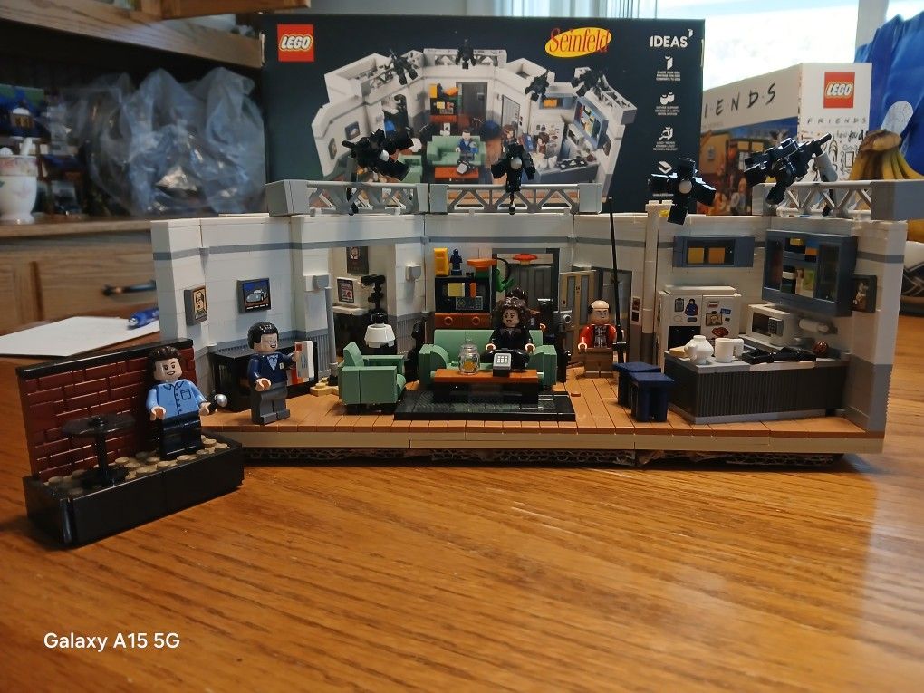 Lego Seinfeld's apartment complete with Seinfeld characters, Jerry, Elaine, George, Kramer and Newman. Set # 21428 Retired. Great detail including Jerry's bike hanging in the back room! Complete set built by an adult collector, never handled only displayed.