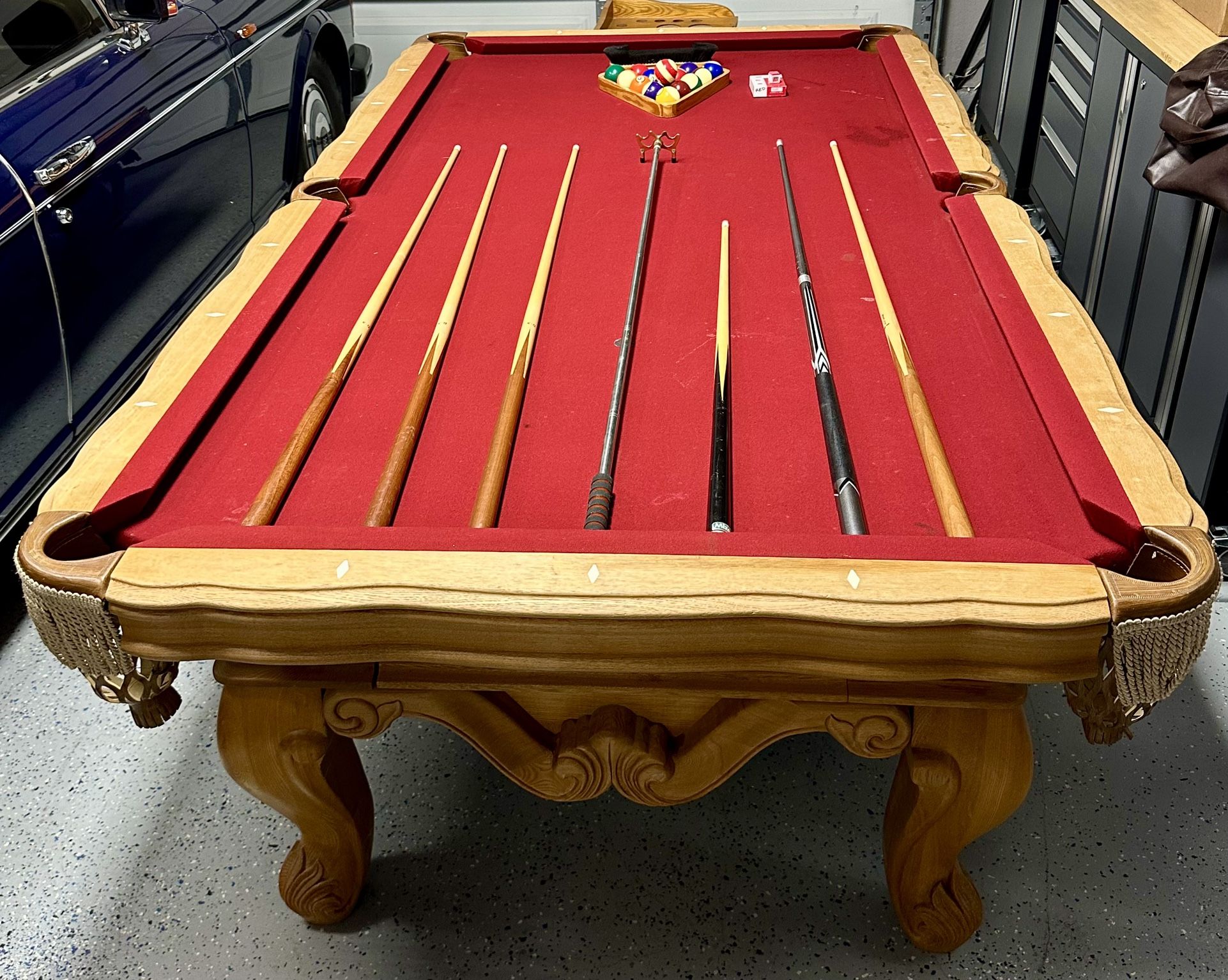 8 foot slate American Billiards pool table Body is in pristine condition and felt is a little used lots of play still left in it. Comes with sticks, cover, balls, chalk, bridge, triangle, brush, rack etc… $1800 delivered Pool Table Delivery Sticks Rack Game room Delivered