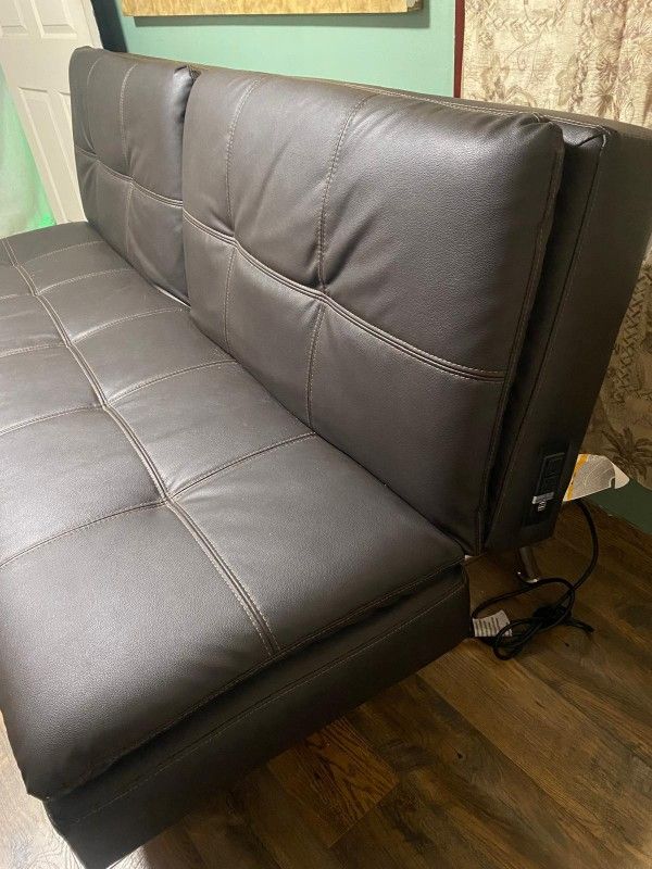 This great Futon Sofa is both stylish and practical. It has a modern design that fits well in any room. Durable leather easy to maintain and clean. The brackets adjusts, so you can use it as comfortable couch or bed for guests. It's perfect for small spaces like apartments, guess rooms. Or home offices. Contact me today! Make an offer. It's must go.