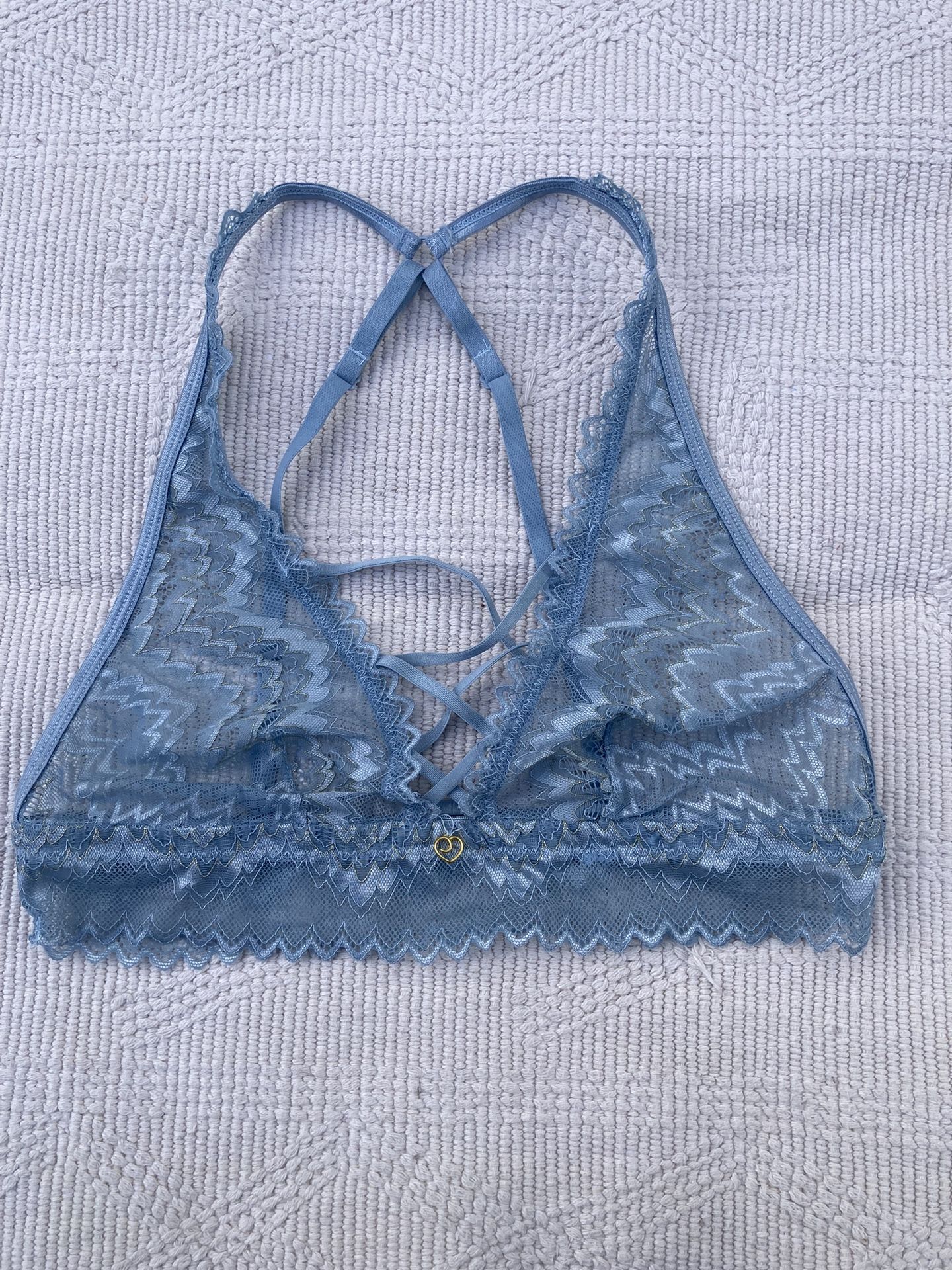 Only worn twice! Delicate light blue lace bralette with lacing in the front. Small medium, should fit 36A -34C