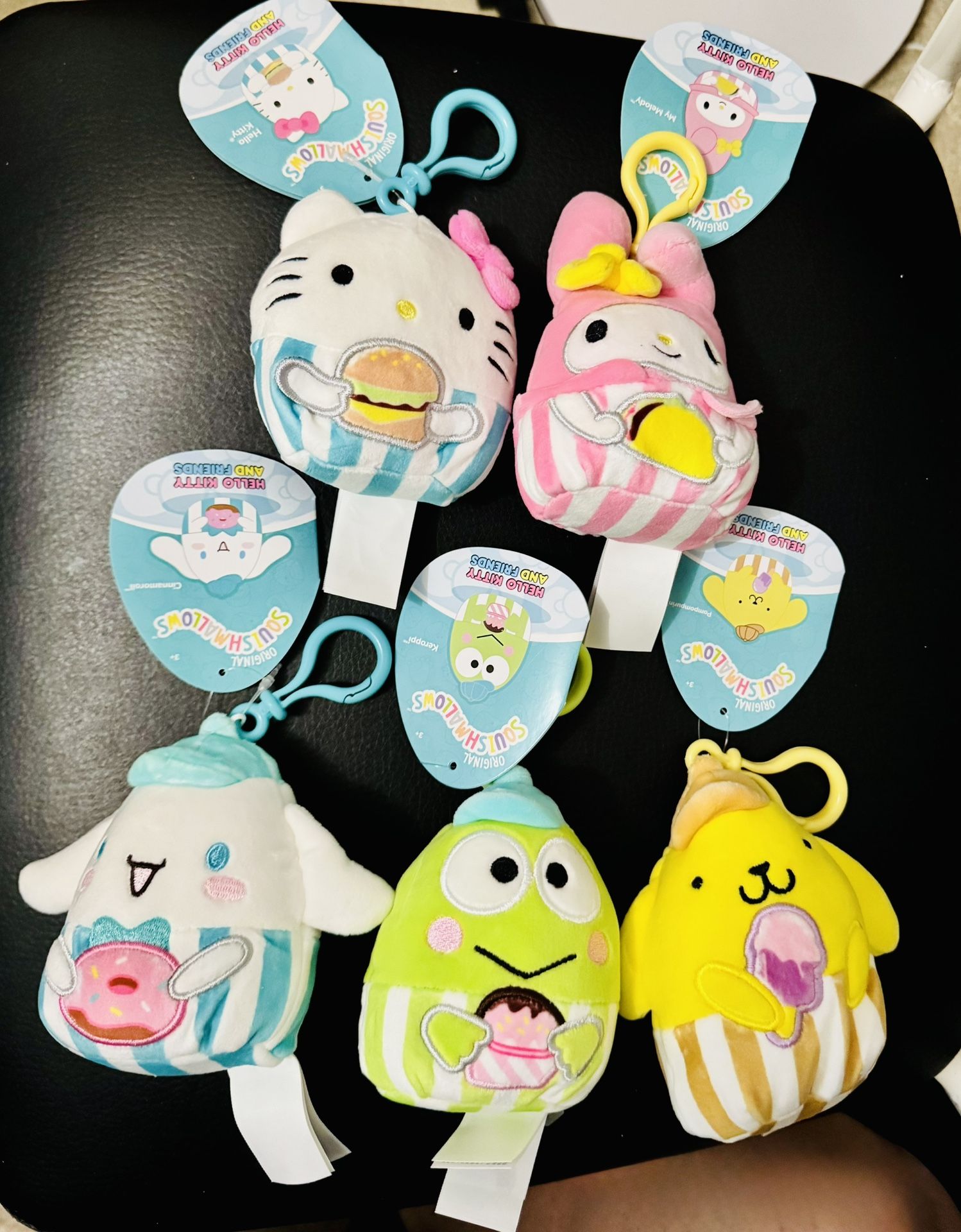 NEW with tags Set of 5 Squishmallows Hello Kitty Sanrio Food Truck Series Clip-On 3.5 inches.Comes from pet and smoke free home. Squishmallows a trademark of Kelly Toy Holdings, LLC Hello Kitty and Friends Food Truck Series Set of 5 Clip-On Keychains Mini Plush Dolls. These are the perfect companions for your keys, backpack, or purse and are adorable and huggable plush toys that feature beloved Hello Kitty characters in vibrant colors and playful designs. Each set includes Hello Kitty holding a hamburger, My Melody holding a taco, Pompompurin holding a popsicle, Cinnamaroll holding a donut, and Keroppi holding a cupcake. Bring your favorite characters with you wherever you go! These mini plushies are cute, compact, and full of personality. Please feel free to reach out if you have any questions.