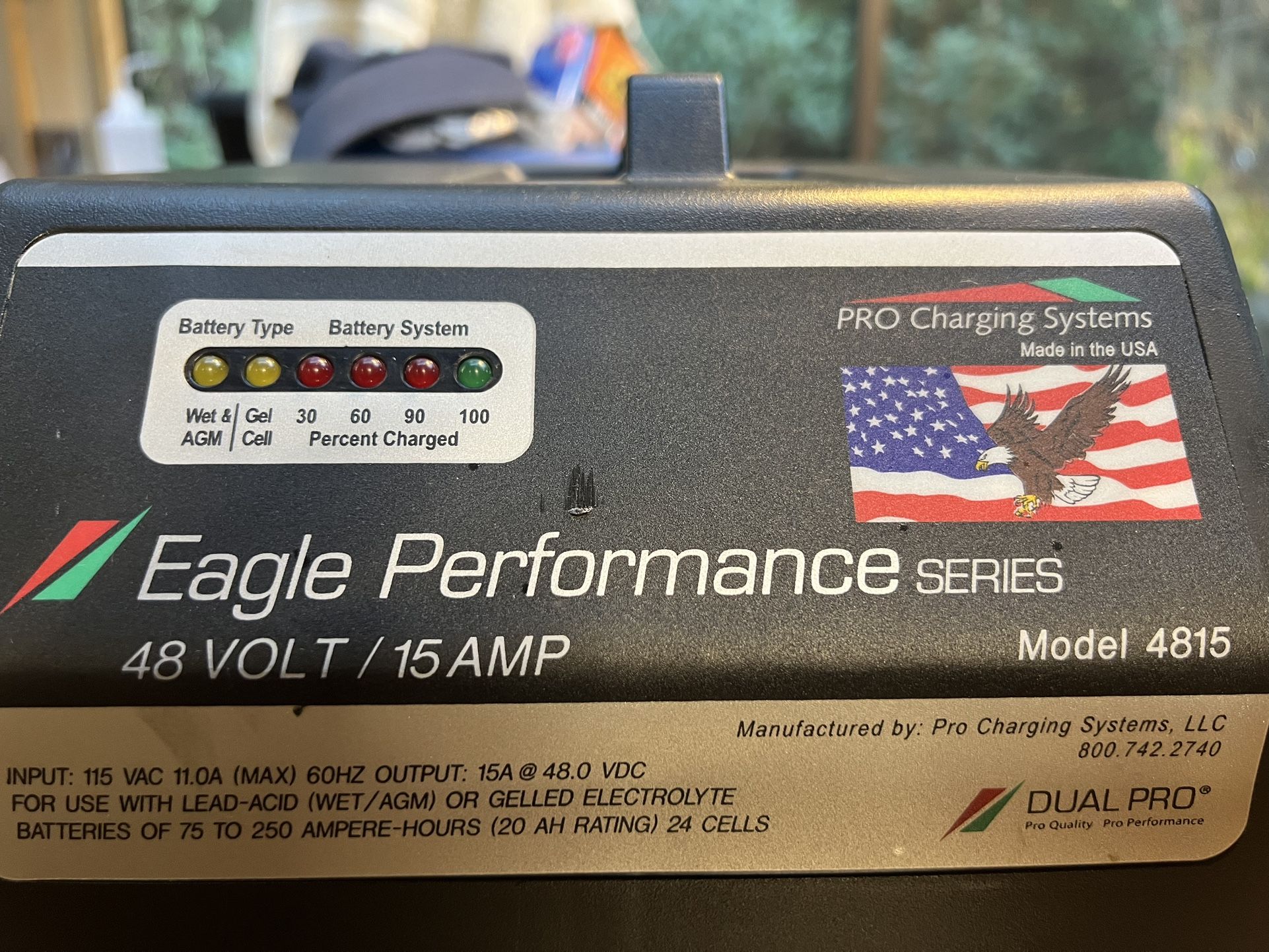 Eagle Performance 48volt, 15 amp charger in very good condition. Has the “Anderson” type connector but could be replaced with something else. Pick up only please.
