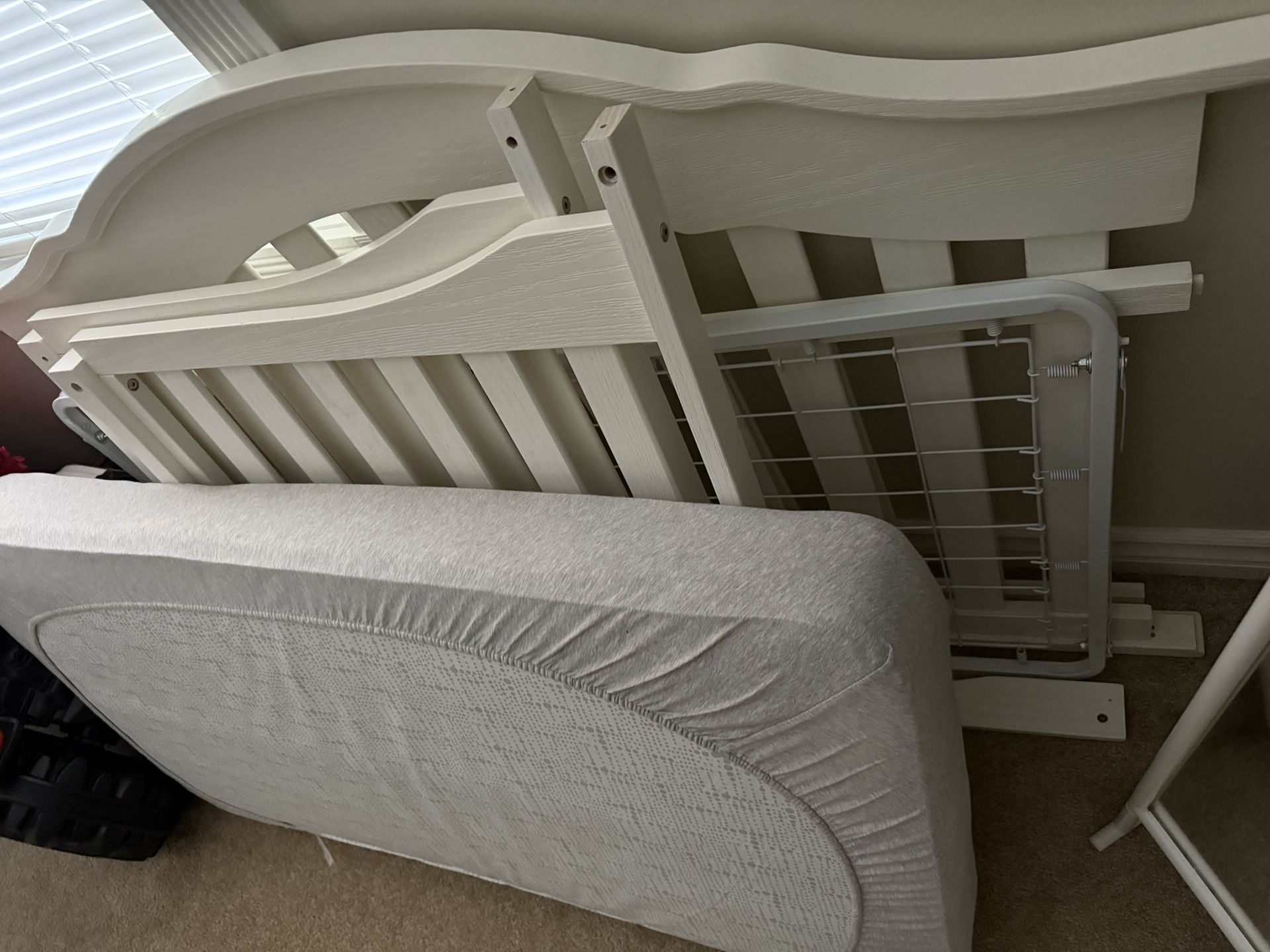 Large size White Baby crib set with mattress in like new condition only used 2 months paid over $300 with mattress selling for $100 it’s a 3 in 1 model purchase at target..