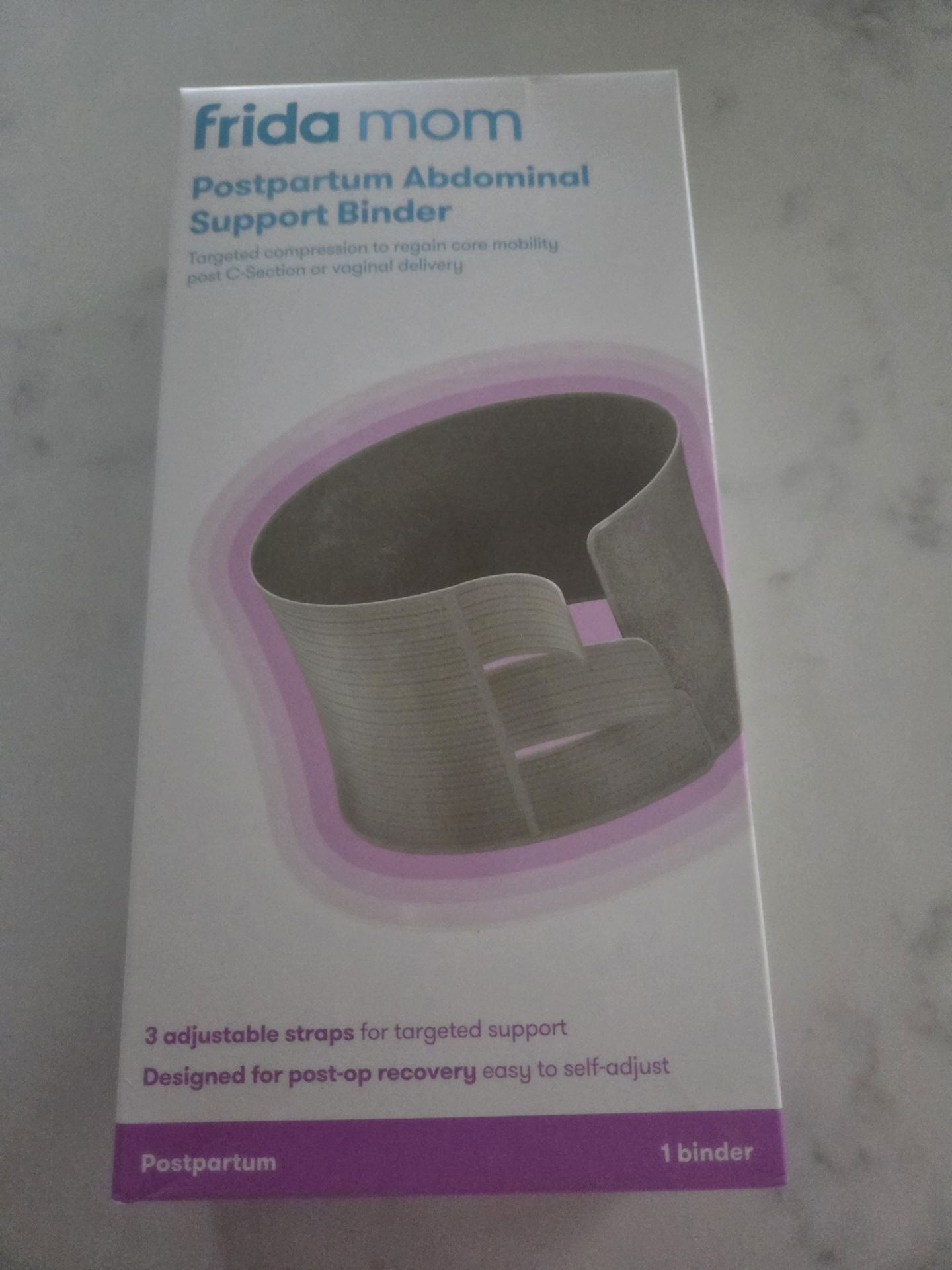 Supportive Frida Mom postpartum belly binder. Has 3 adjustable straps for targeted support. Designed for post-op recovery after C-section or vaginal delivery. Easy to self-adjust. Super clean, no issues.