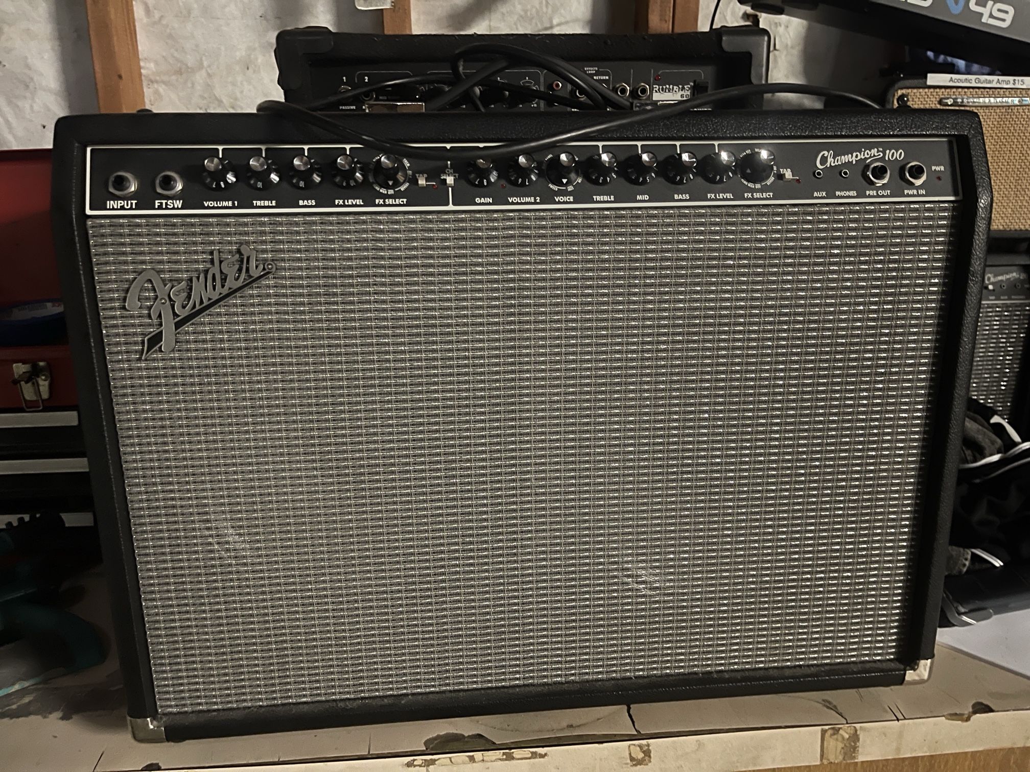 Selling a Fender Champion 100 solid-state combo amp. Loud, reliable, and super versatile. great for practice, band rehearsals, and live gigs. Details: • 100 watts • Dual 12” Fender Special Design speakers • 2 channels (Clean + Effects/Voicings) • Multiple amp voicings (clean, tweed, British, metal, etc.) • Built-in effects (reverb, delay, chorus, tremolo, more) • Footswitch compatible • Excellent pedal platform • Solid-state (no tubes, low maintenance) Condition: Good working condition. Everything functions as it should. Minor cosmetic wear from normal use.