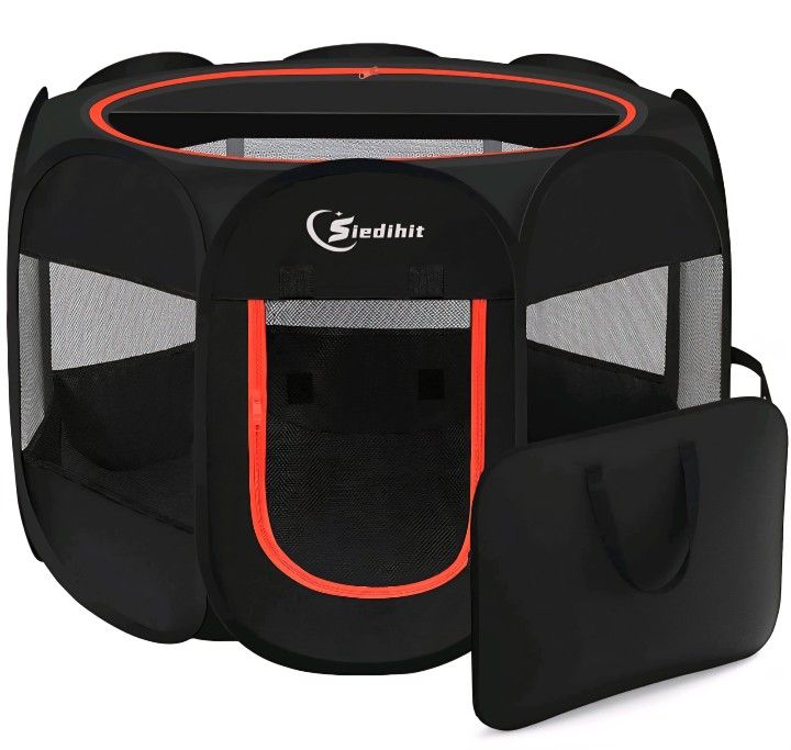 New Siedihit Black Dog Cat Playpen, Puppy Pet Playpen Indoor for Small Dog Crate Tent Cage Outdoor, Portable Pop Up Dogs Enclosure Kennel with Carrying Case for Dogs/Cats/Rabbits. Features & Details Color Black Product Style Portable Pop-up Item Shape Octagonal Additional details Material Type Polyester Item Dimensions L x W x H 25"L x 25"W x 17"H Closure Type Zipper pet playpen is made of high-grade thick mesh and 600D polyester Oxford cloth, made of durable waterproof material. Seams and corners are reinforced, not easily damaged by pets. Consists of 8 mesh side panels and a half mesh top, well ventilated. You can have a 360-degree view of your pet's condition, and you can also give your pet a panoramic view of its surroundings. 【Easy to use】The pet playpen on the side of this pet pen can be easily rolled up and pasted, making it easy for your pet to get in and out of the pet pen. Close the door and keep your pet safely inside. The detachable semi-mesh zipper top can be easily removed for indoor use and closed for outdoor use to provide shade. Make sure your pet is comfortable in any environment.