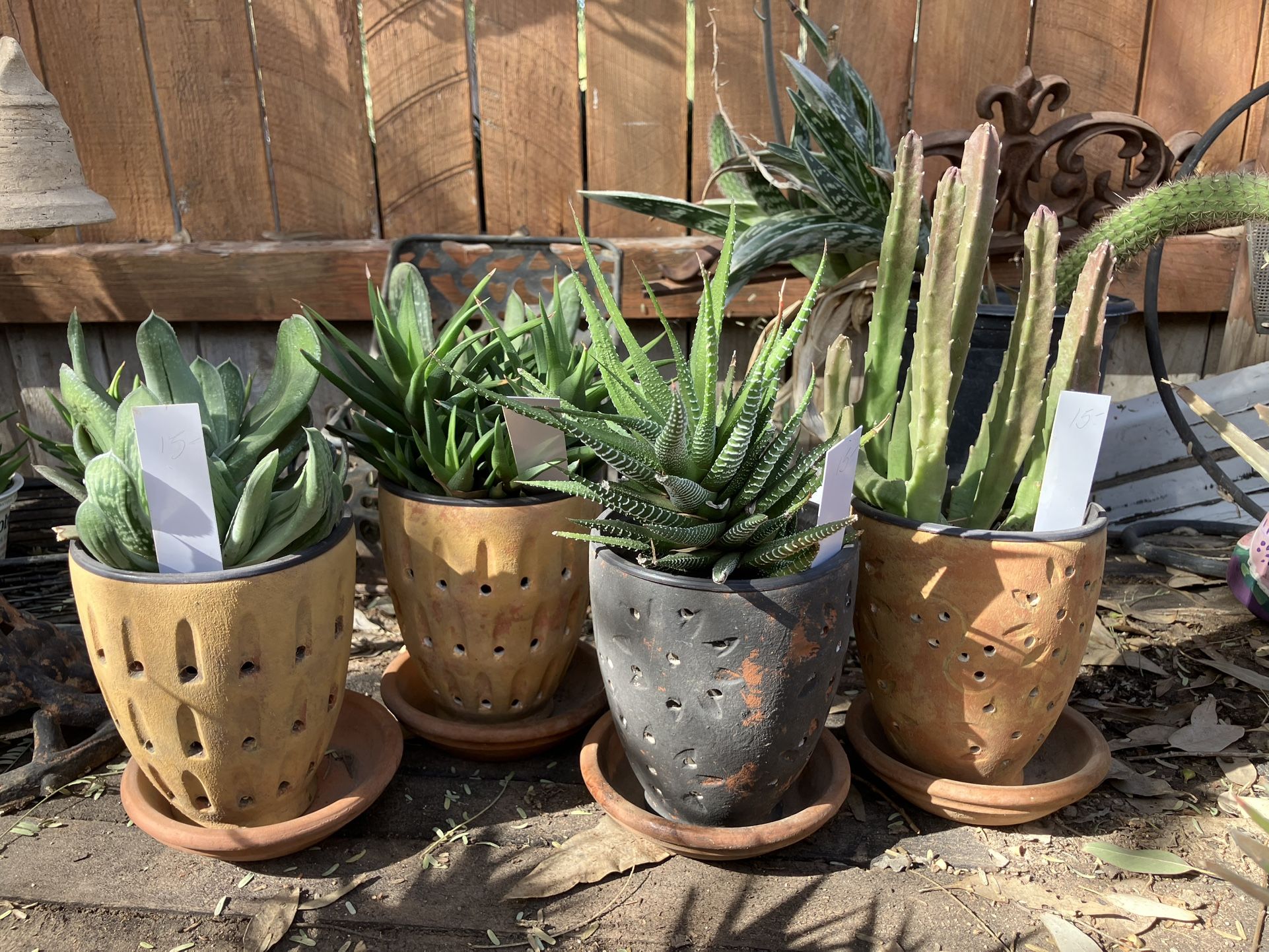 Upside-down lamp shades $15 each Coffee cup $12 each Basket with 3 plants $30 with 4 $35 Flat metal container $12 Metal mug w/blooming aloe $15 Easy maintenance
