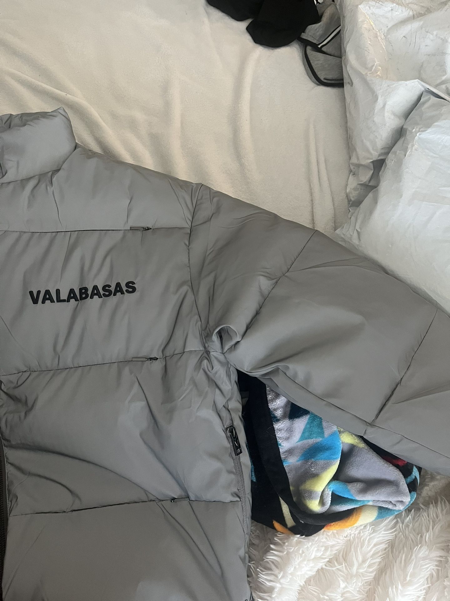 super nice soft inside reflectable outside a greyish white puffers super heavywieght and thick nice lettering and material. puffer goes for 168$ selling for 65$. RUN A SIZE BIG