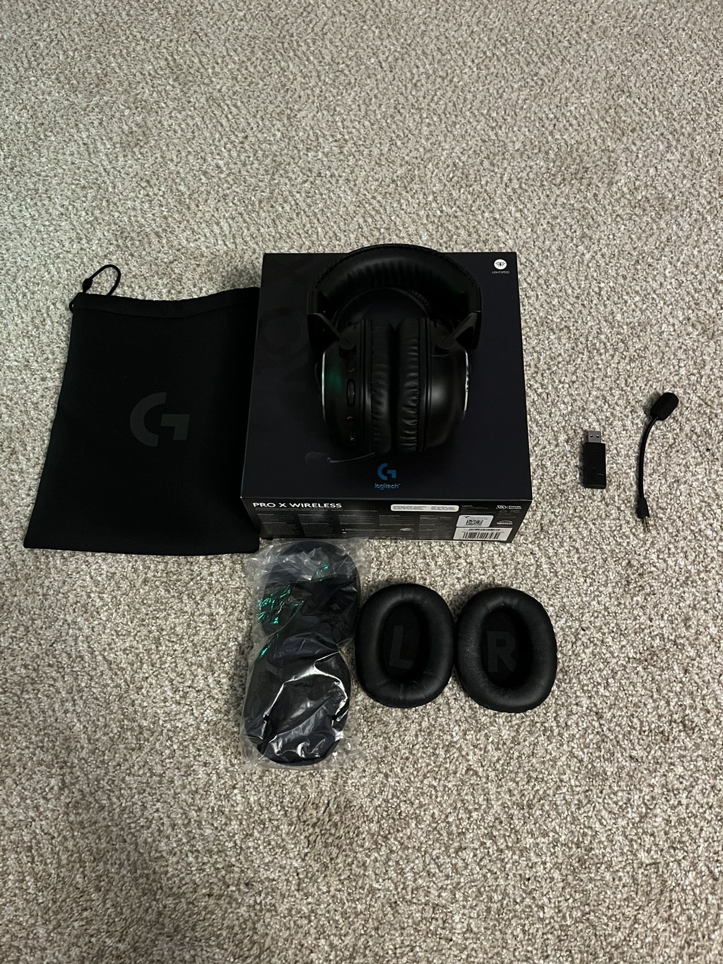 Logitech G Pro X Wireless headset comes with everything you see in the pictures one already installed ear pads and two different ear pads that came with the headset so a total of 3 sets. Also, the wireless USB 2.4gh dongle to connect the headset to your pc and use it wireless also works wired with a USB-C cable. Comes with the blue mic that came with the headset that is detachable if you don’t want to use it and also a carrying pouch to safely take the headset where ever your ant without giving it feats or scratches. Don’t have the cable that comes with the headset to charge it, but you can use any ISB-C cable to charge it even a Apple MAC USB-C charger will work with it or you can always contact Logitech and tell them to send you one for your headset.