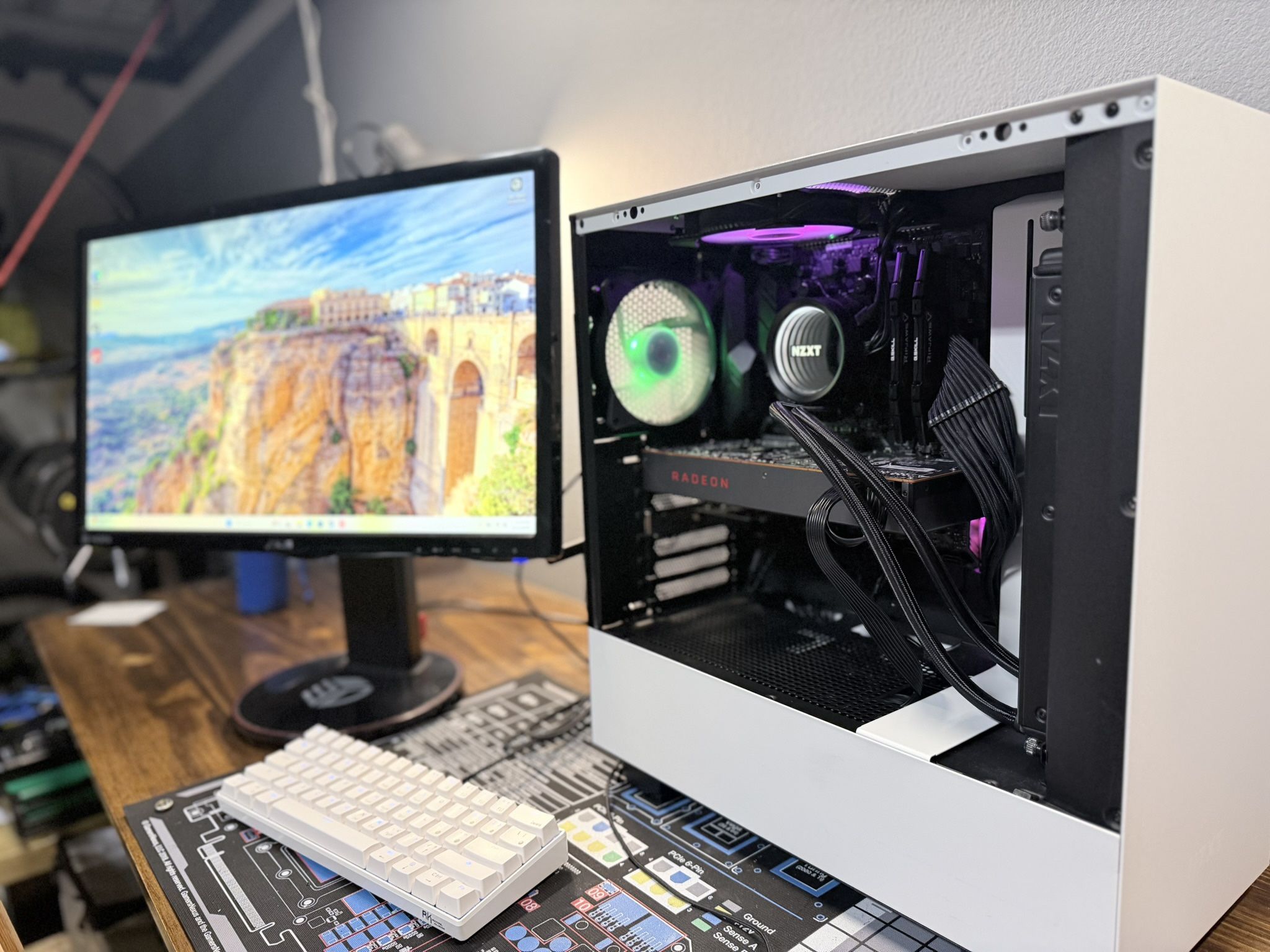 My friend builds gaming PCs for fun. He had extra parts and decided to build one. No problem’s at all! Here are the specs Gaming PC with High-refresh monitor mouse and keyboard like new, lightly used with clean Windows 11 install no bloat. Latest GPU and chipset drivers installed. Latest BIOS installed. PC: Case: NZXT H510 CPU: Ryzen 7 3800X GPU: AMD RX 5700 (XT Bios) CPU Cooler: Liquid AIO NZXT X53 240mm RAM: G Skill 16GB DDR4 3200 MHz Storage: 1TB SSD WD Blue Motherboard: Asus TUF B450M-PLUS Gaming WiFi: WiFi 6 + Bluetooth 5.3 MONITOR: Asus 24” 144hz refresh display KEYBOARD: White Royale Kludge RK61 MOUSE: Razer Deathadder Elite