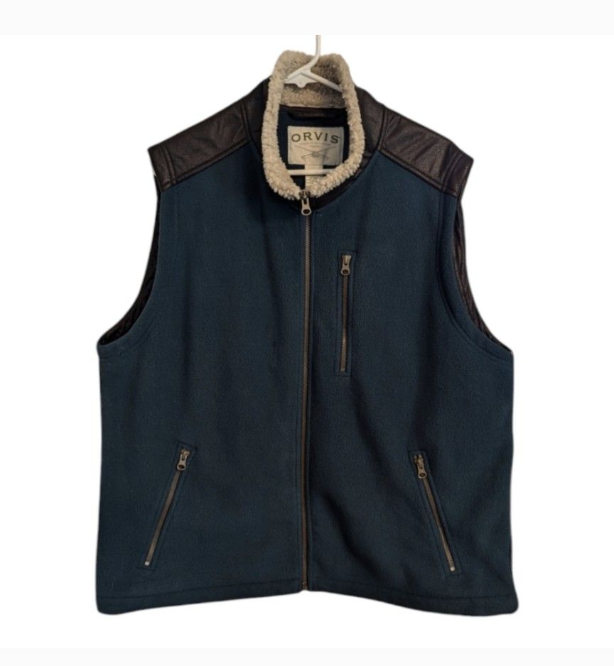 Orvis Vest Teal Blue Green Fleece Full Zip Sherpa Collar Faux Leather Collar & Shoulder Vest Men's Large Brand: Orvis Colors: Deep Teal (Blue/Green) & Brown. •Deep Teal (blue green) fleece vest •Brown faux leather accents at shoulders, collar, and lining inside arm holes •Three zipper front pockets •Two inside hip pockets •Heavy duty metal zippers. •Adjustable elastic at waist •8X4L, 682589 •100% polyester •Machine washes and dries beautifully. Approximate Measurements Taken With Item Lying Flat And Unstretched Armpit To Armpit: 24" Overall Length From Shoulder: 26" Excellent Pre-owned Condition. No Apparent Stains, Holes Or Fading. This Is My Partner And He No Longer Needs. From Smoke Free Household. Cash And Pickup Only