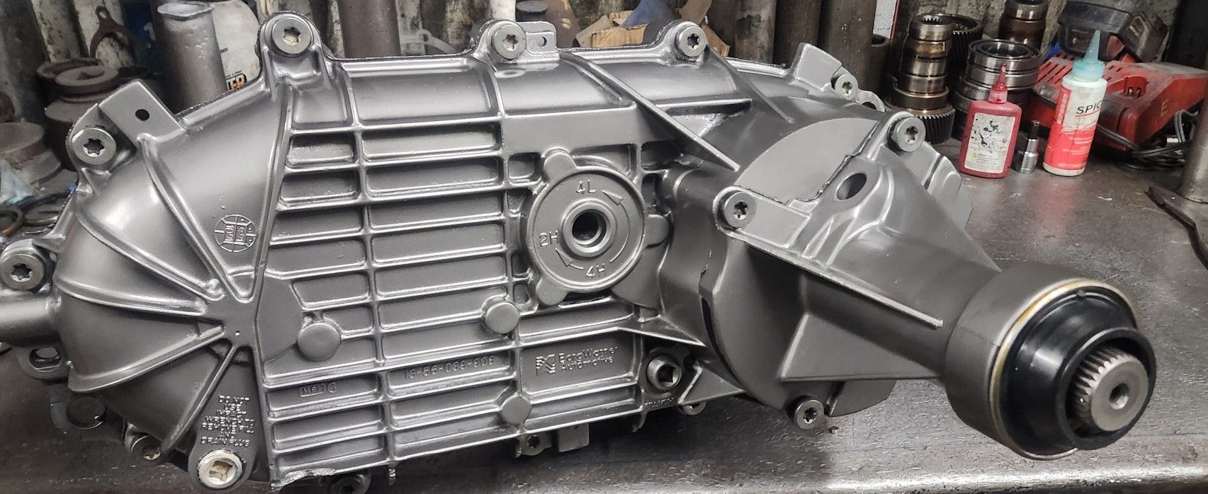 89'-96' FORD BW1356 TRANSFER CASE ASSEMBLY #F2TA-AB ASSEMBLY #: F2TA-AB INTERCHANGABLE ASSEMBLY #'S: E9TA-SA E9TA-TA F5TA-HA F6TA-YA F0TA-PA F0TA-RA 31 SPLINE INPUT REAR SLIP YOKE OUTPUT NO SPEEDOMETER HOLE ON TAIL HOUSING BOLT ON FRONT OUTPUT YOKE