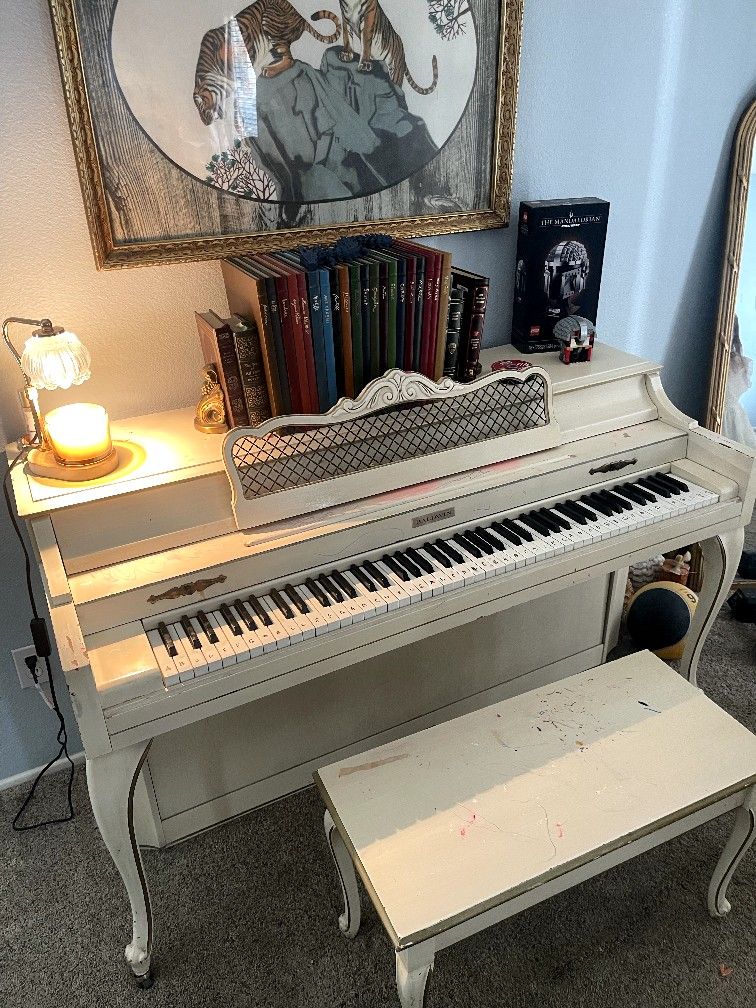 Very nice Cream Colored Poano with Matching Bench. All keys work but it needs Tunning (may have some Crayon marks from my grandkids) I hate to let it go as I bought it for my daughter, but we are moving and don't have the room!