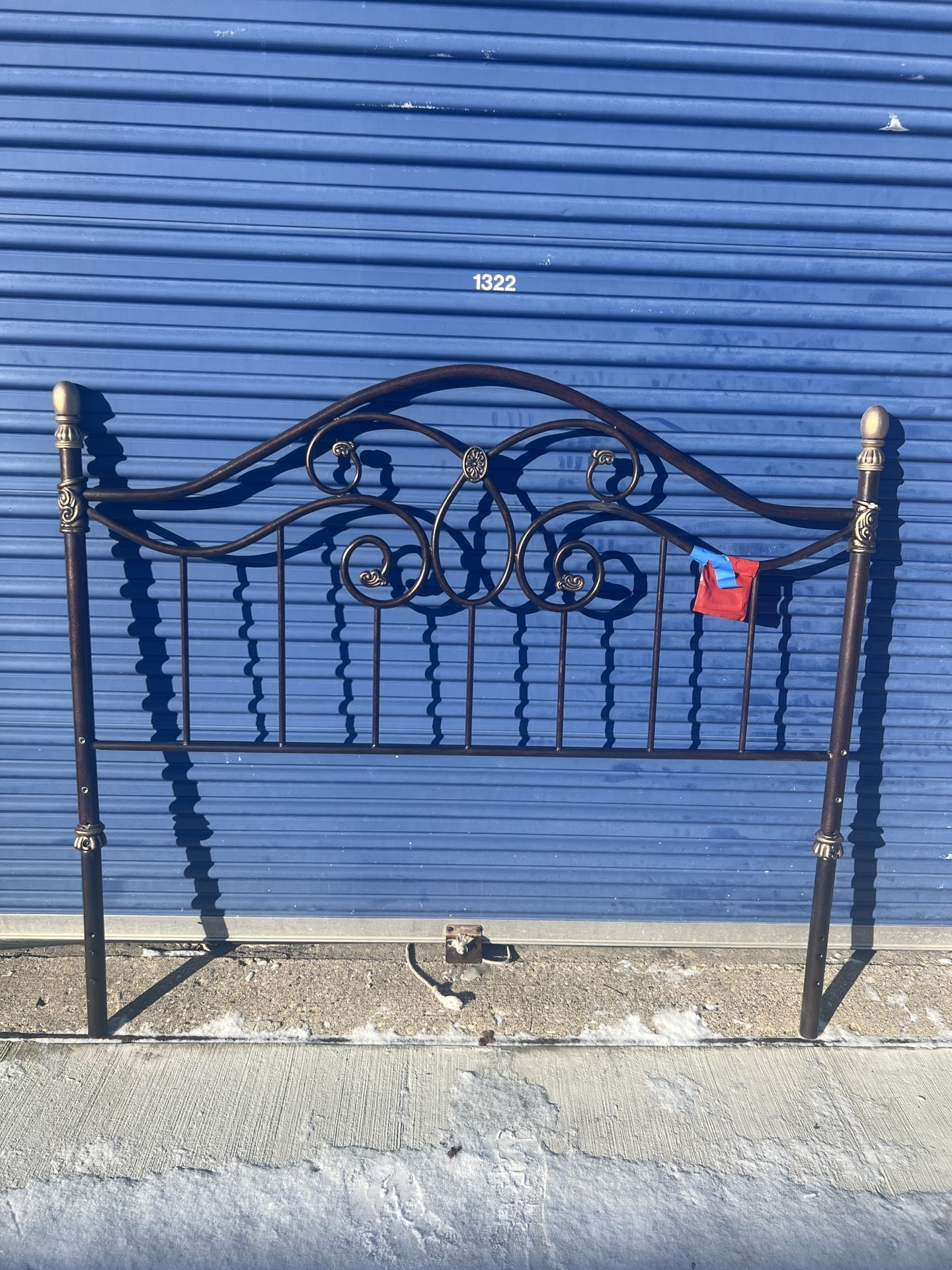 This headboard is a traditional-style metal headboard featuring ornate scrollwork and finials, often available in a metallic brown, antique bronze, or antique brass finish. This design is very common and can complement various decor styles, from classic to farmhouse. Key Features Design: Arched with decorative scroll details and curved spindles. Material: Typically forged from heavy gauge steel or iron for durability. Finish: Common finishes include metallic brown, dark bronze, or painted antique brass color. Compatibility: Often designed with adjustable height options and adapter plates for compatibility with most standard bed frames (Full/Queen size is common). Measurements are 61” wide and 54 1/2” tall. POOS