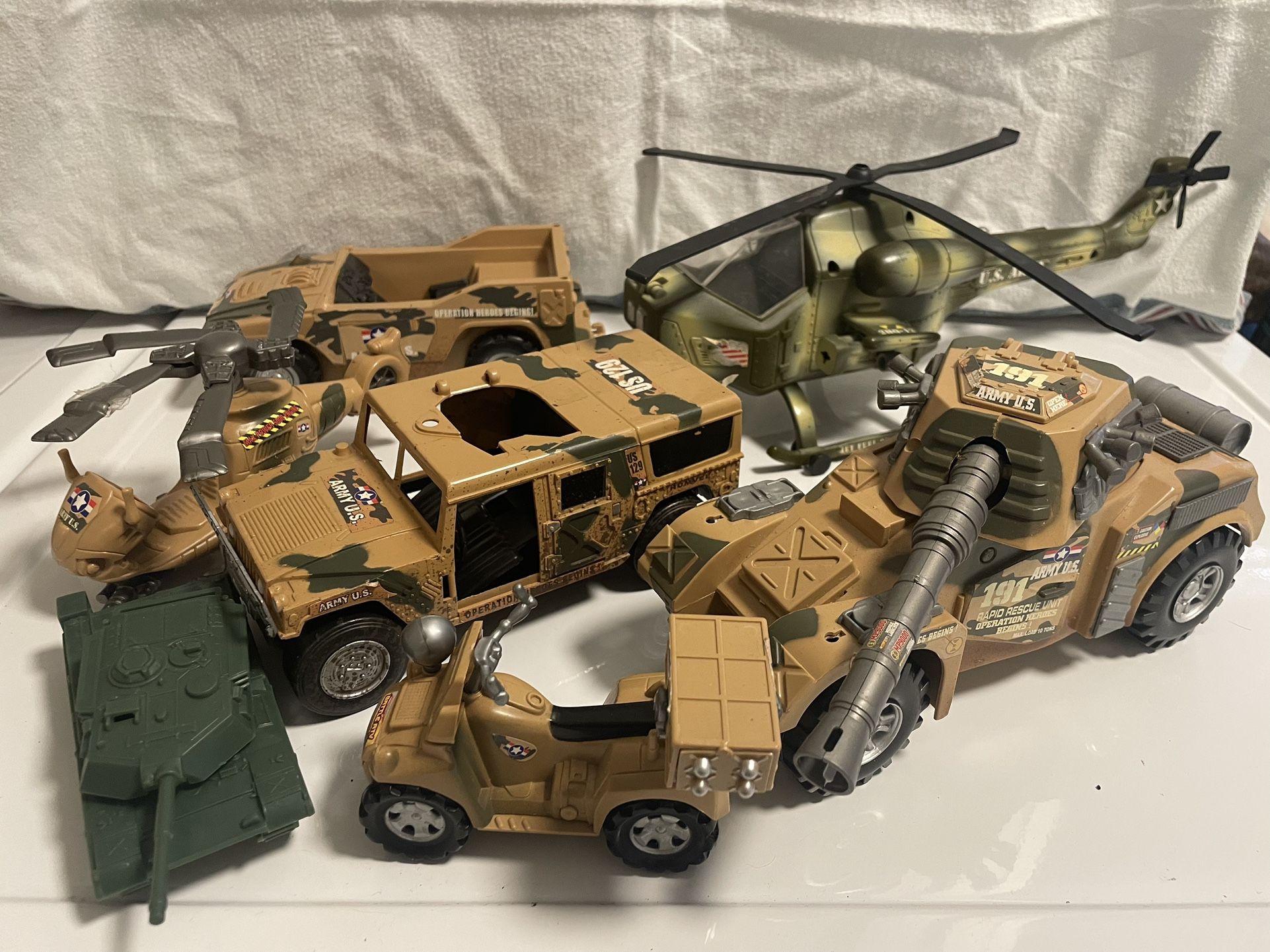 ποΈ Army Toy Vehicle Bundle β 7-Piece Set Selling a fun bundle of military/army toy vehicles, perfect for imaginative play or as a gift for kids who love action scenes. The set includes: π’ 2 Military Helicopters π’ 2 Humvees / Tactical Trucks π’ 1 Tank π’ 1 Armored Cannon Vehicle π’ 1 Mini Military Scooter All toys are in good condition and lots of life left. Great for setups, pretend missions, or outdoor play.