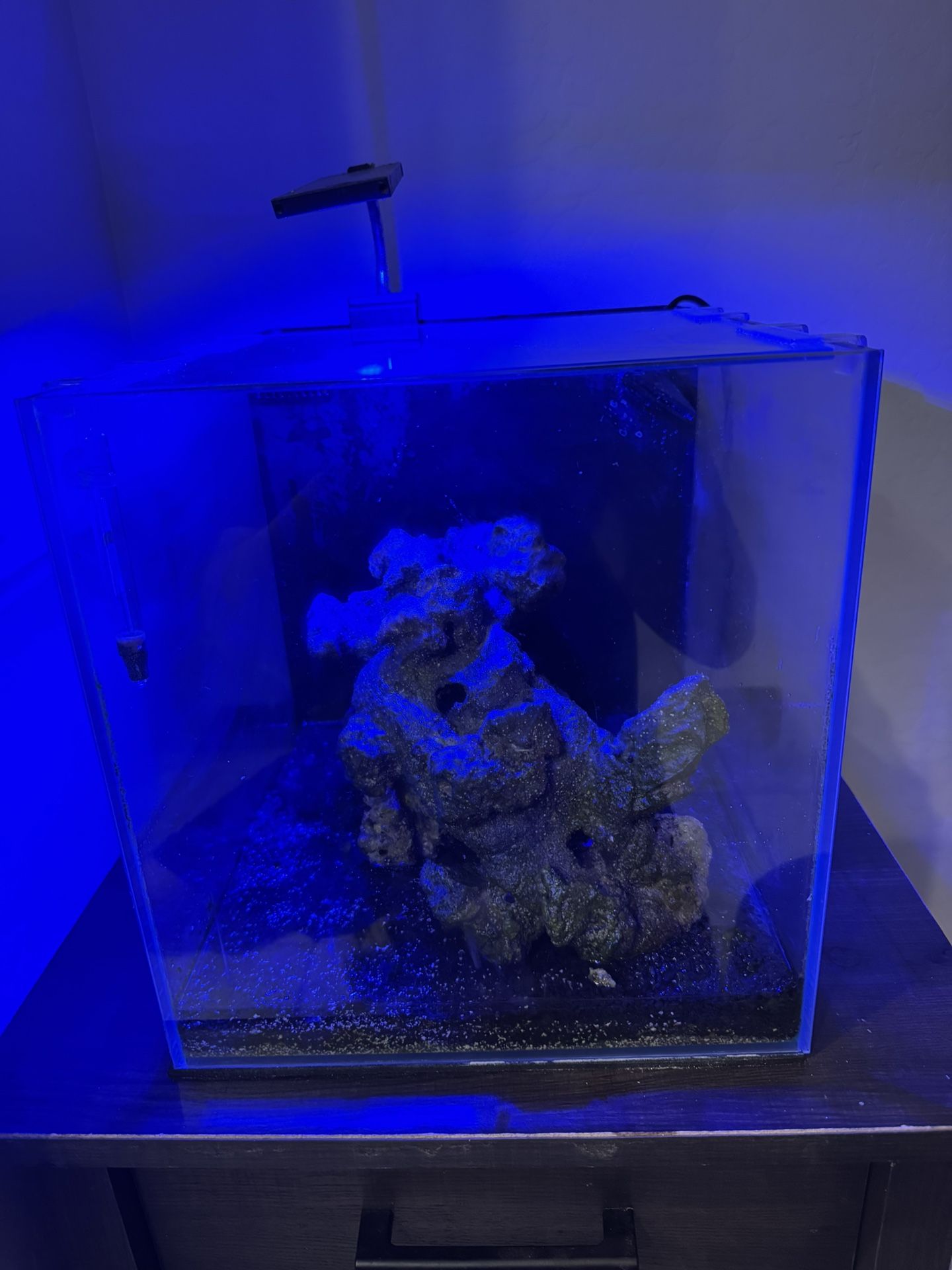 Salt water tank with live rock. Substrate, filter, and rocks all included. Includes stand.