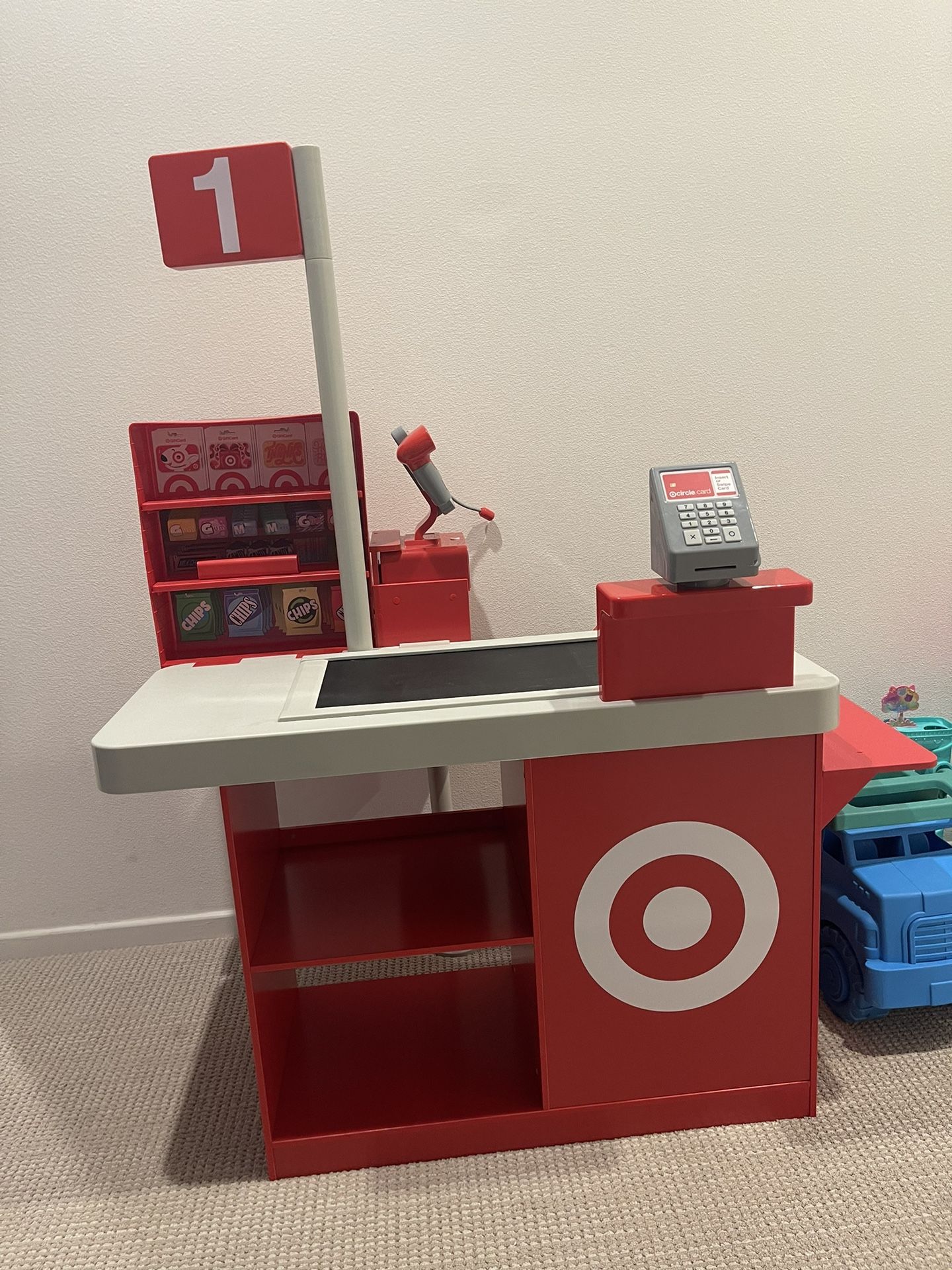 Brand new, hardly used Target check out lane. We bought, built and played for about a day. Everything works. Bought for $150 a few weeks ago. It’s a pretty cool toy, my kids just aren’t inside enough to enjoy! You would need to pick up and transport. Dimensions (Overall): 52.35 Inches (H) x 41.67 Inches (W) x 26.17 Inches (D)