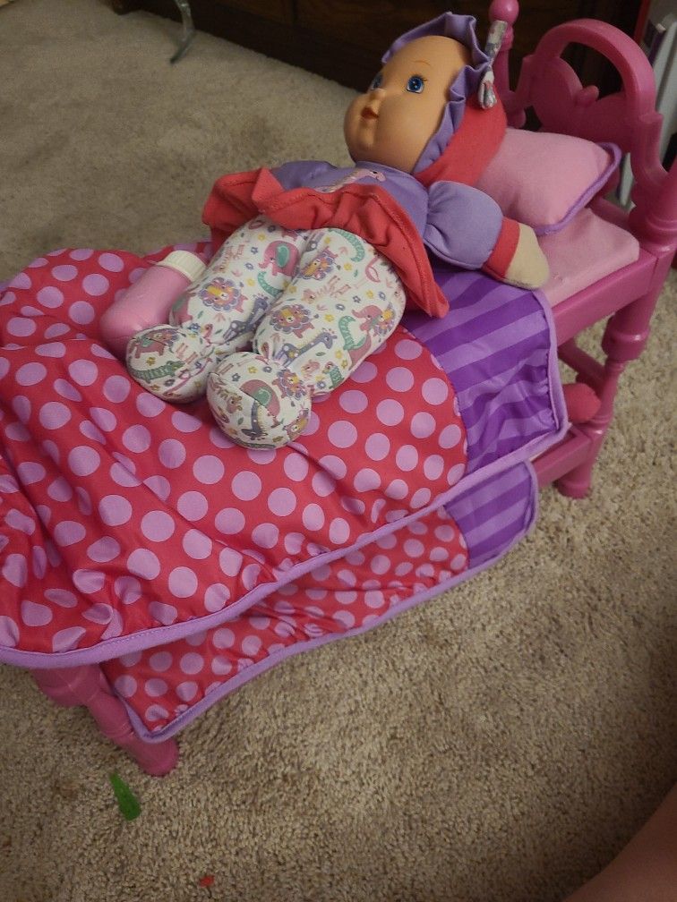 Baby Doll With Bed Blanket Pillows And Bottle Thag Makes Sound