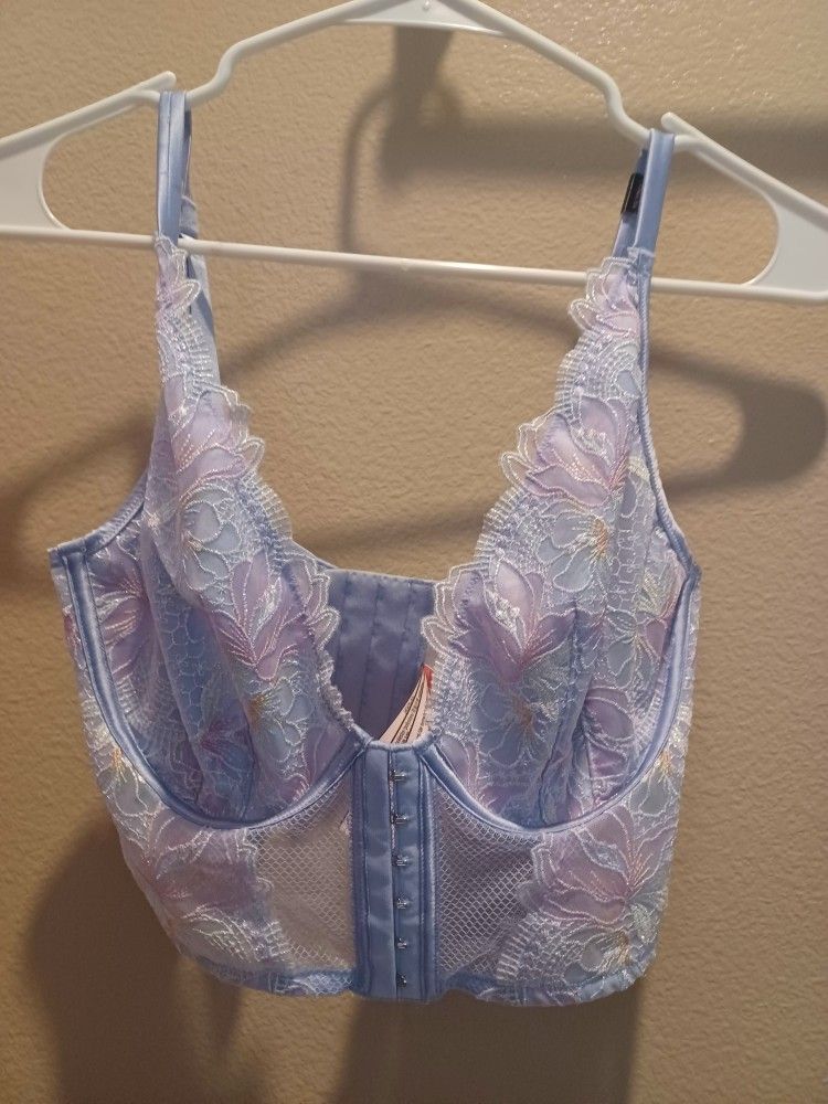 Brand new, bought wrong cup size. Tags still attached. This adorable VS bralette is a soft lavender color with pops of pastels throughout the iridescent lace. Mesh back with 5 loop hooks. Size Small with DD cups Originally $80, asking $15