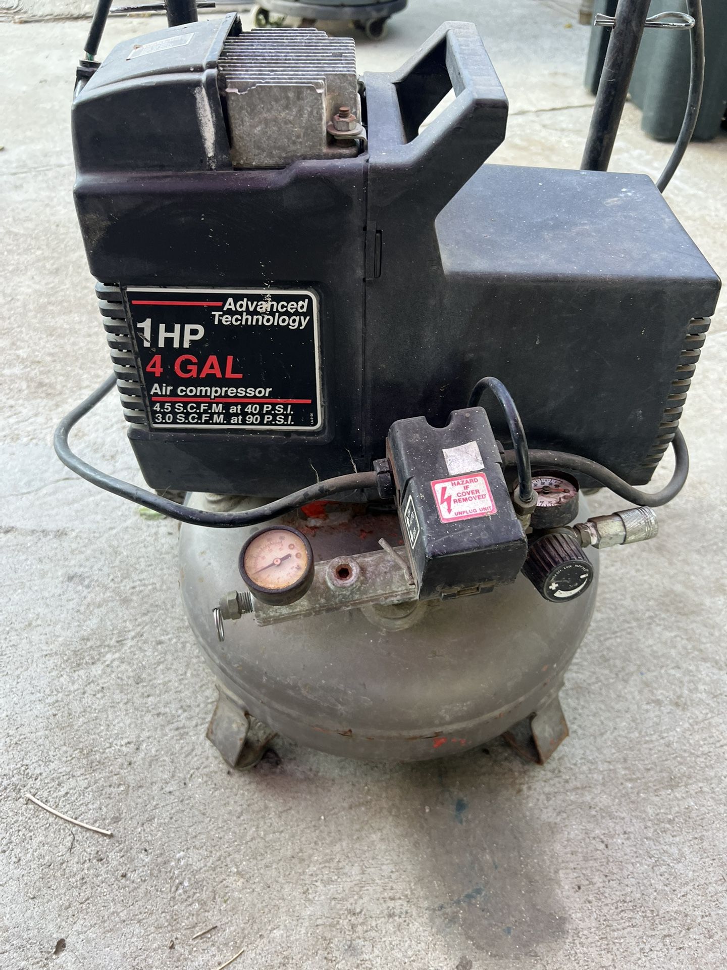 Advanced Technology 4 gallon air compressor. Customized with a roller for easier use perfect for on the job or around the house jobs. Works good. Take it for 120