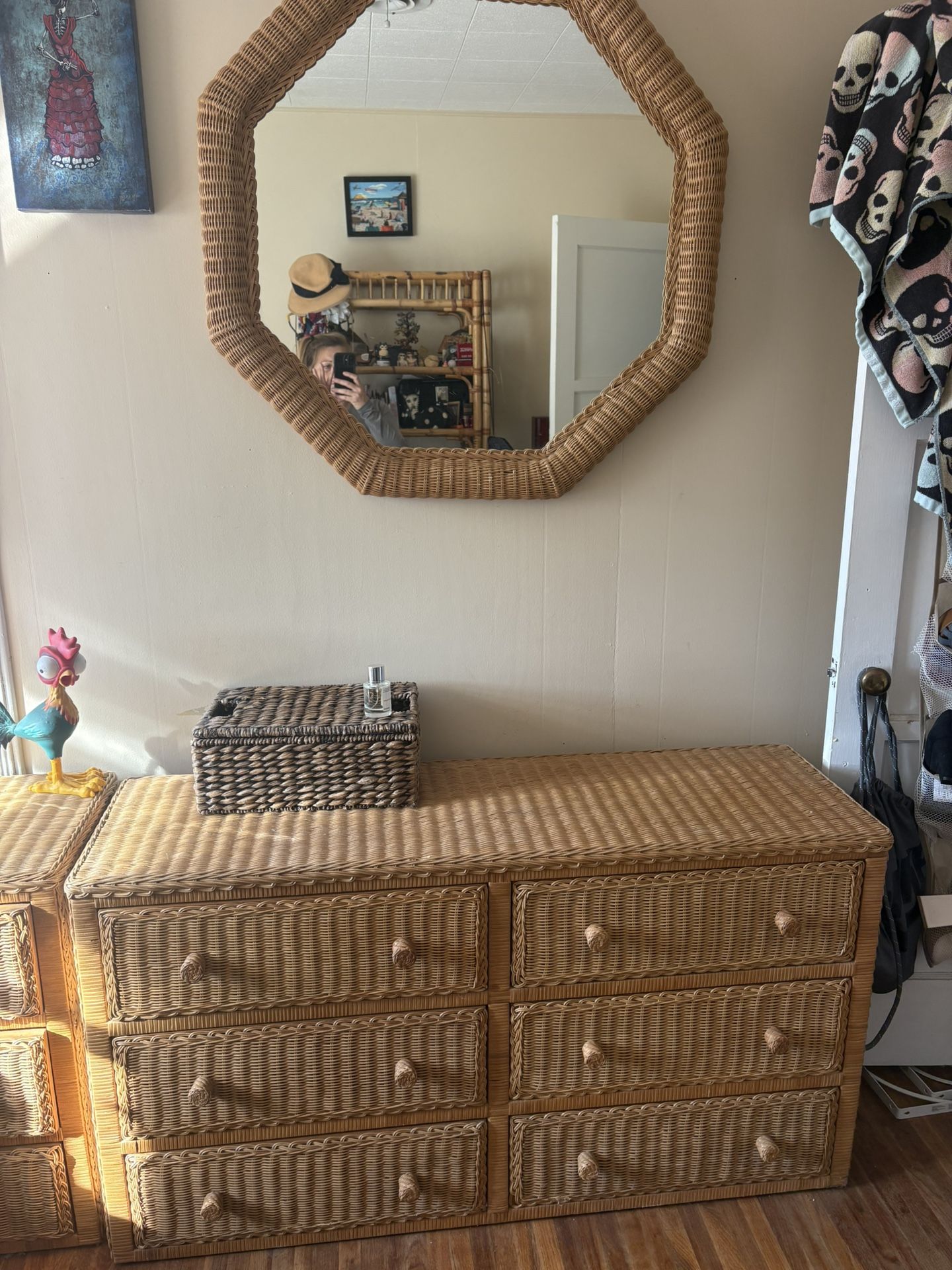 2 dressers and mirror 6 drawer dresser- 52” x 29” d: 16” 3 drawer dresser- 27” x 29” d: 16” Octagonal mirror: 36” x 36” If sold separately, 6 drawer: $300, 3 drawer: $150 and mirror: $75