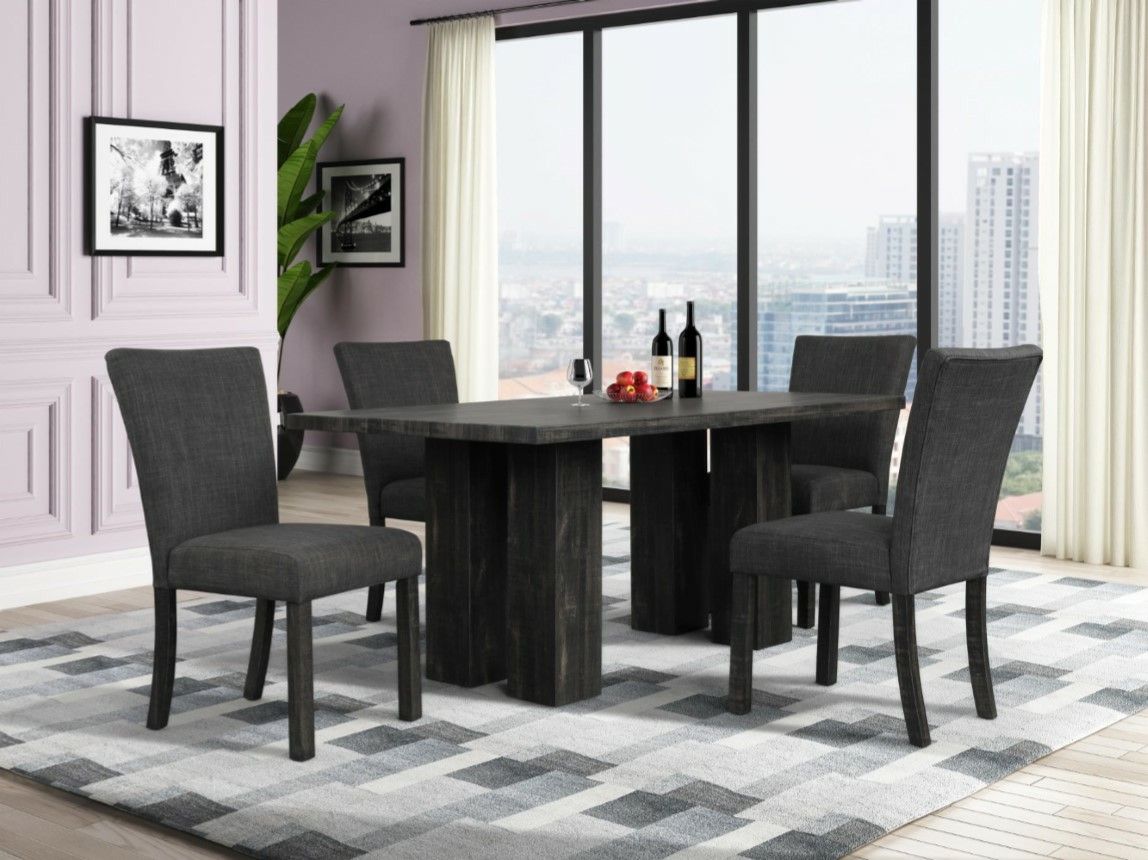 Brand New 5pc Grey Finish Dining Set With Charcoal Grey Linen Chairs