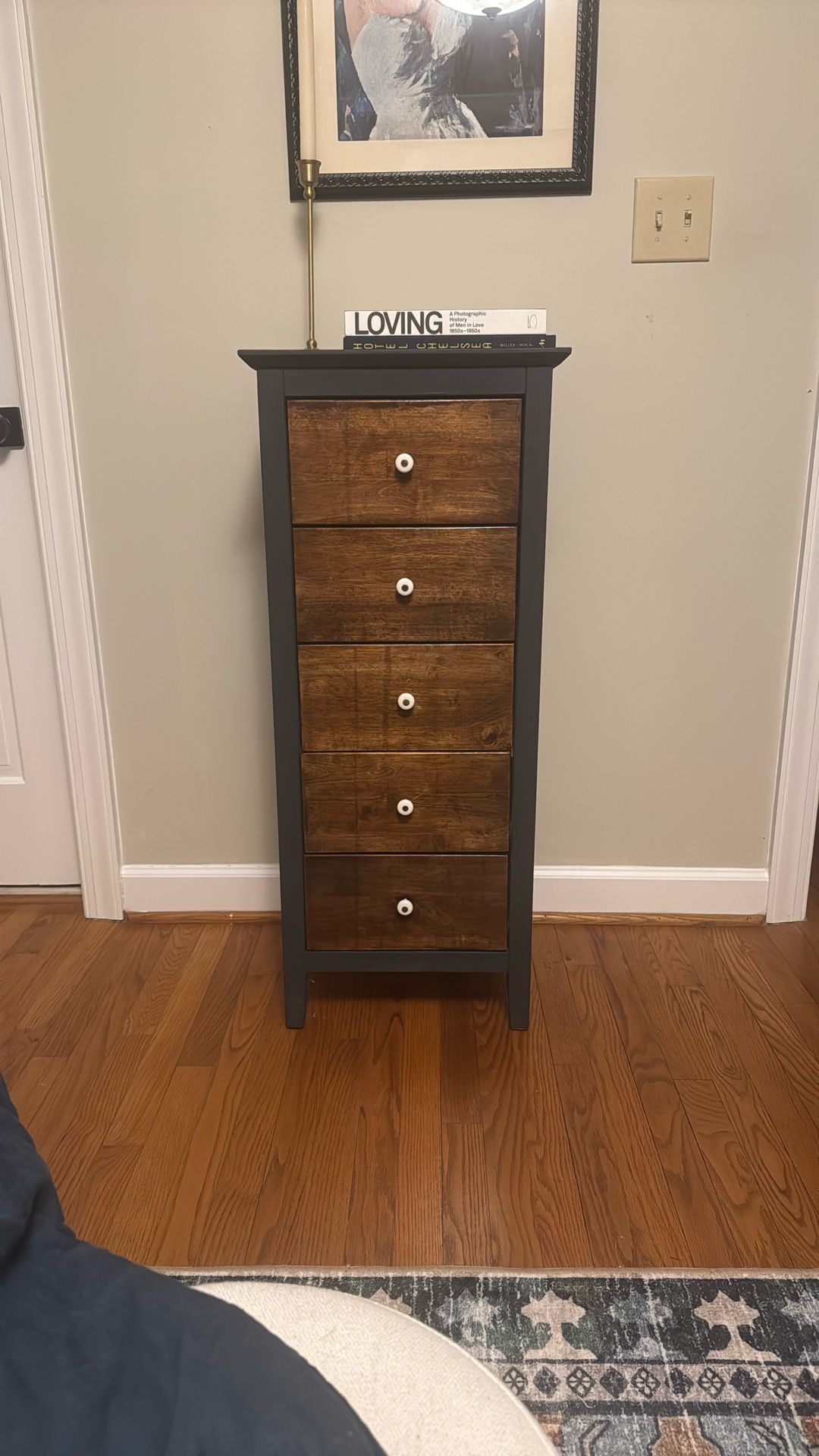 Upcycled 5- Drawer piece in a deep navy color with walnut stained drawer faces and antique ceramic and brass knobs. Looking to rehome this piece. Refinished it and lightly used, some scratches on the top but it’s got great character. Interior of drawers are unstained to prevent color transfer. Was in the home of no smokers and no animals. 40x17x15 inches