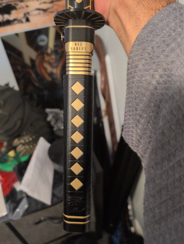 Looking to sell my neo saber shogun lightsaber (will not let me show the blade itself), the blade detaches and is mainly a display/prop/cosplay use item, no real use for light saber combat. It's fully functional, comes with a c plus cord and a USB instruction for added sound board and warranty with neo saber. It's in great condition and only used for cosplay once for a summer con. Bought this item for 500, but looking for 400. Willing to negotiate with money and partial trade of interest, but cash wise won't go lower than probably 320. PS. Uses a small allen wrench to remove bolts, may need smaller wrench bolts as extra replacements.