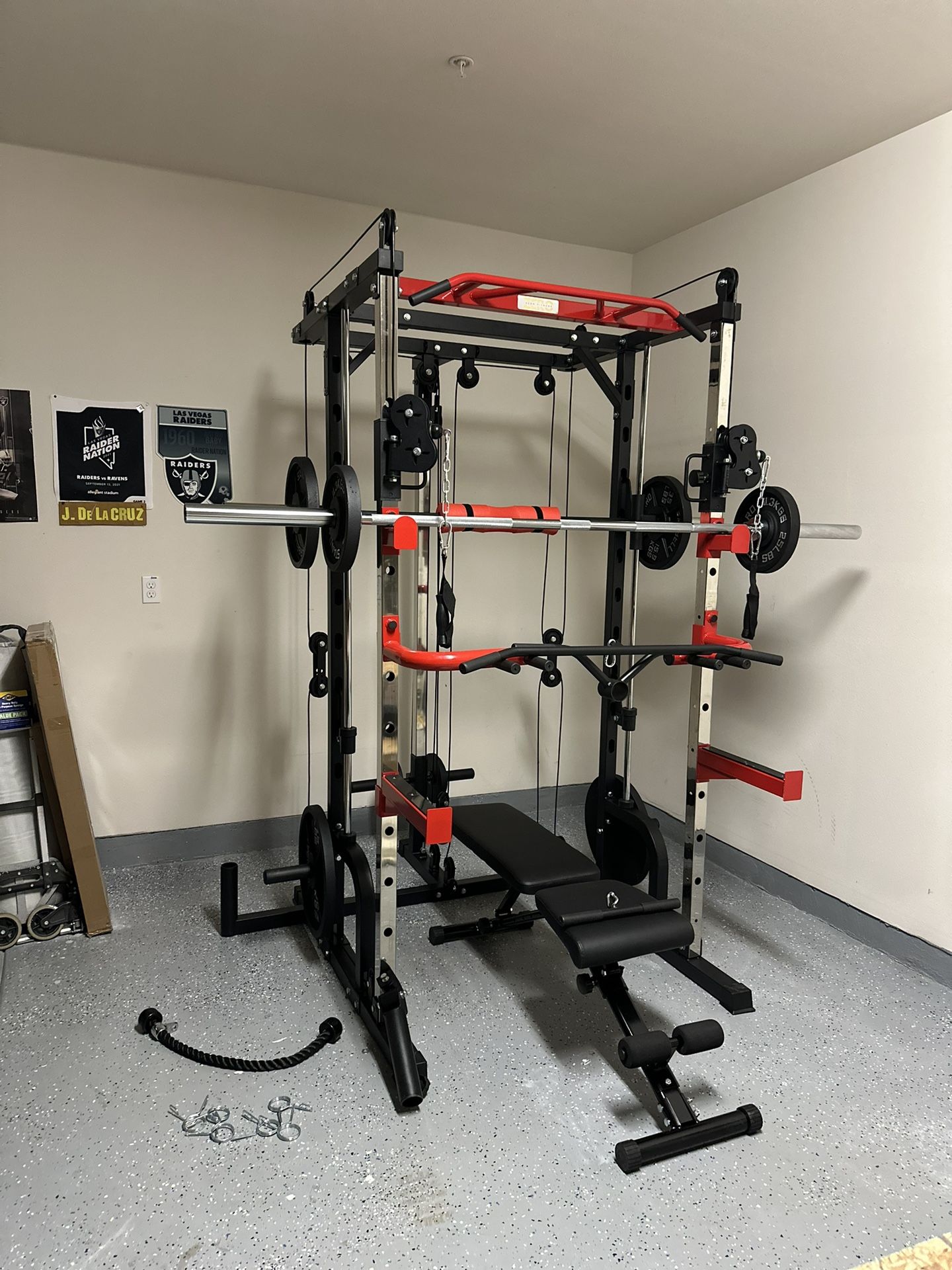 Smith Machine 100 Bundle 🏋️ New In Box! FREE DELIVERY AT FULL PRICE!Click Profile For More Gym Listings! Only Account! Cash / Credit Cards / Finance Available! WARRANTY INCLUDED This bundle includes a pulley system with two adjustable pulleys from top to bottom and one at the bottom, a bicep curl/row bar, two handles, a pull-up bar, a landmine, a landmine attachment, a T-bar row, a straight bar, a 25lbs fixed Smith machine bar, and a lat bar. Also included is a complete cast iron weight set with a pair of each of the following weights: 45lbs, 35lbs, 25lbs, 10lbs, 5lbs, 2.5lbs, and a 45lbs advanced Olympic bar. An adjustable bench is also included in the package. Please note that assembly is not included, but can be arranged for an additional fee of $299. This includes assembly of the Smith machine, setting up weights on the machine, and removal of all empty boxes. Machine specifications include a total weight of 300lbs, a maximum plate load of 450lbs, a multi-grip pull-up bar with rubber and a ring for resistance band-assisted pull-ups, commercial sealed bearing pulleys, and multiple post plate storage to keep weights off the floor. The assembled dimensions are 70″L x 72″W x 92″H, and please note that the attached barbell is included in the width. Upgrades or Add Ons •Free Switch to 230lb Bumpers Plates 45s/35s/25s/10s •$40 3ft by 3ft Rubber Mats •$90 4ft 20lbs Curl OLYMPIC WEIGHTS GYM EQUIPMENT OLYMPIC STANDARD WEIGHT SLED PUSH SLED WEIGHTS WEIGHT PESAS SQUAT RACK POWER CAGE SMITH MACHINE BENCH PRESS INCLINE DECLINE BARBELL BAR HEX BAR BUMPER PLATES ADJUSTABLE BENCH FLAT BENCH BENCH DUMBBELLS DUMBELL ADJUSTABLE DUMBBELLS KETTLE BELLS DIP STATION PULL UPS PULL DOWN BATTLE ROPE BOWFLEX POWERTEC POWERBLOCKS HOIST BODY SOLID ROGUE FITNESS EXERCISE
