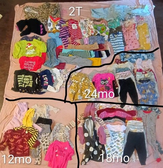 12M-2T *Girls (mostly Winter) Most are size 2T and in good used condition, a few play clothes mixed in as well. I'm only willing to separate each size, not per item. 10- Size 12M 18- Size 18M 15- Size 24M 50- Size 2T (Winter) 19- Size 24-2T (Summer) 112 items total $45 for all or ask for price on a specific size *Yes, I'm aware some items are typical "boy" items.