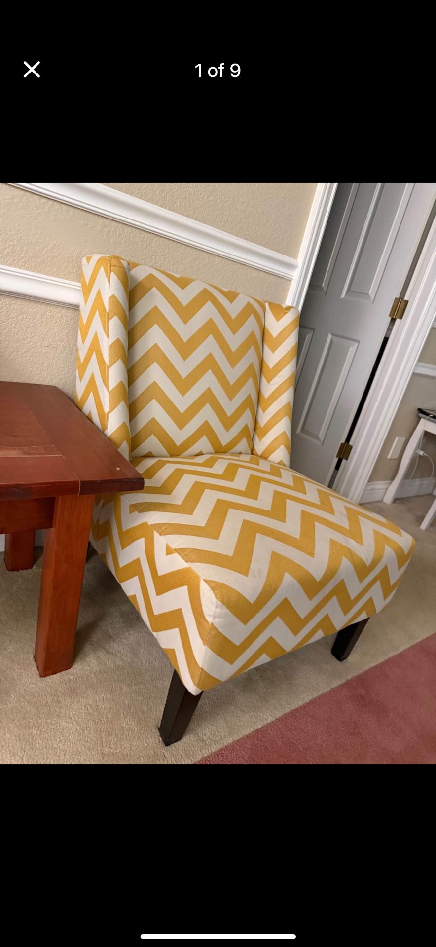 This stylish armless accent chair is designed with a Yellow and Creamy Off White Chevron pattern. Single sofa design with four sturdy wooden legs. Premium quality material made of a wood frame and high density foam cushion. Sells for about $130-$150 brand new. Asking $100. Pick up in Fair Oaks. Please come with a car/truck that can fit this chair. Measures 25.5"W x 28.5"D x 34.5" H. Need picked up ASAP. Thanks