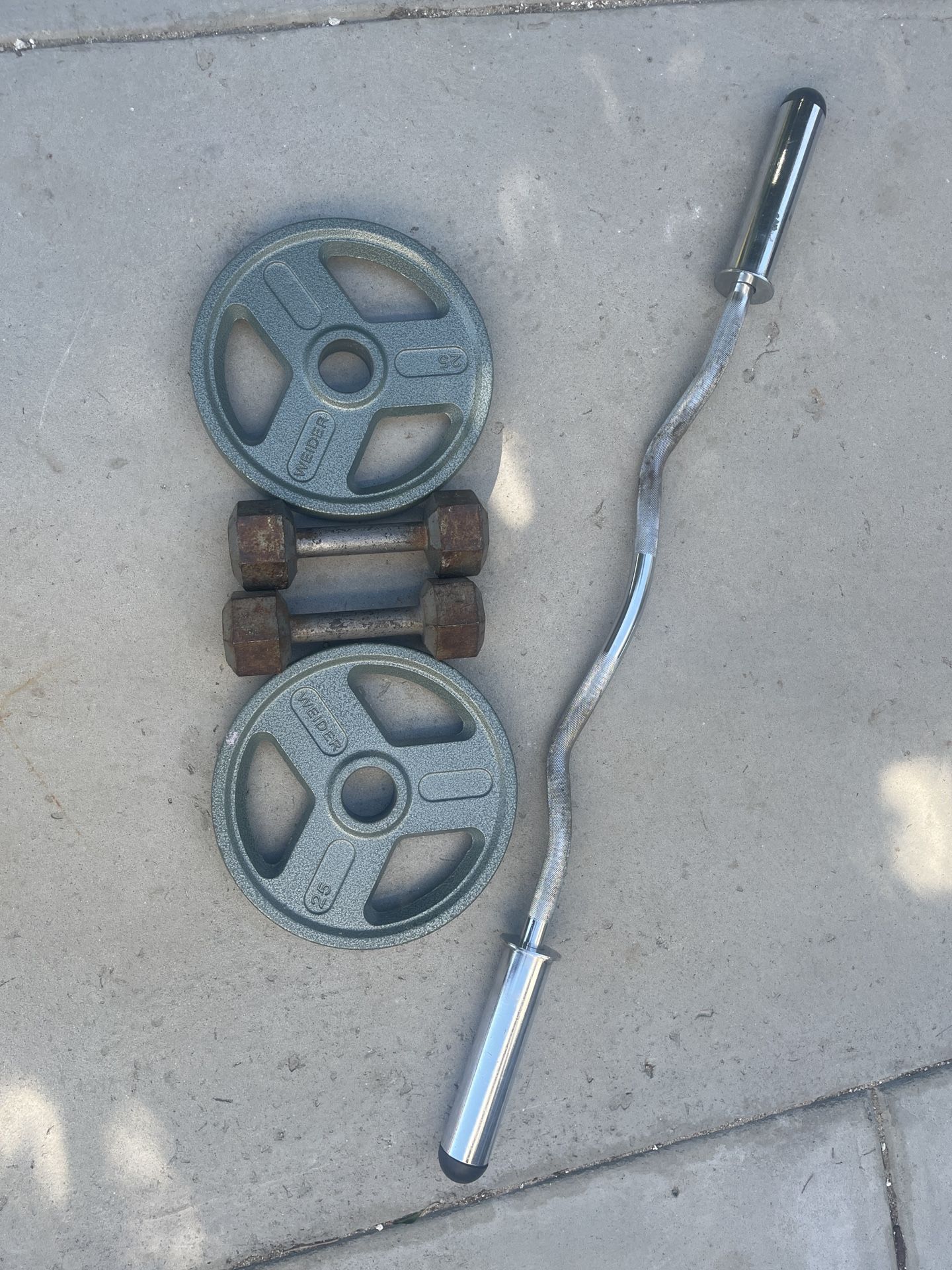 Used workout equipment includes EZ curl bar, two 25 lb Weider cast-iron plates (50 lb total), and two 10lb dumbbells Normal c wear from use; everything works as it should. Great starter set for home gym. Pickup and cash only