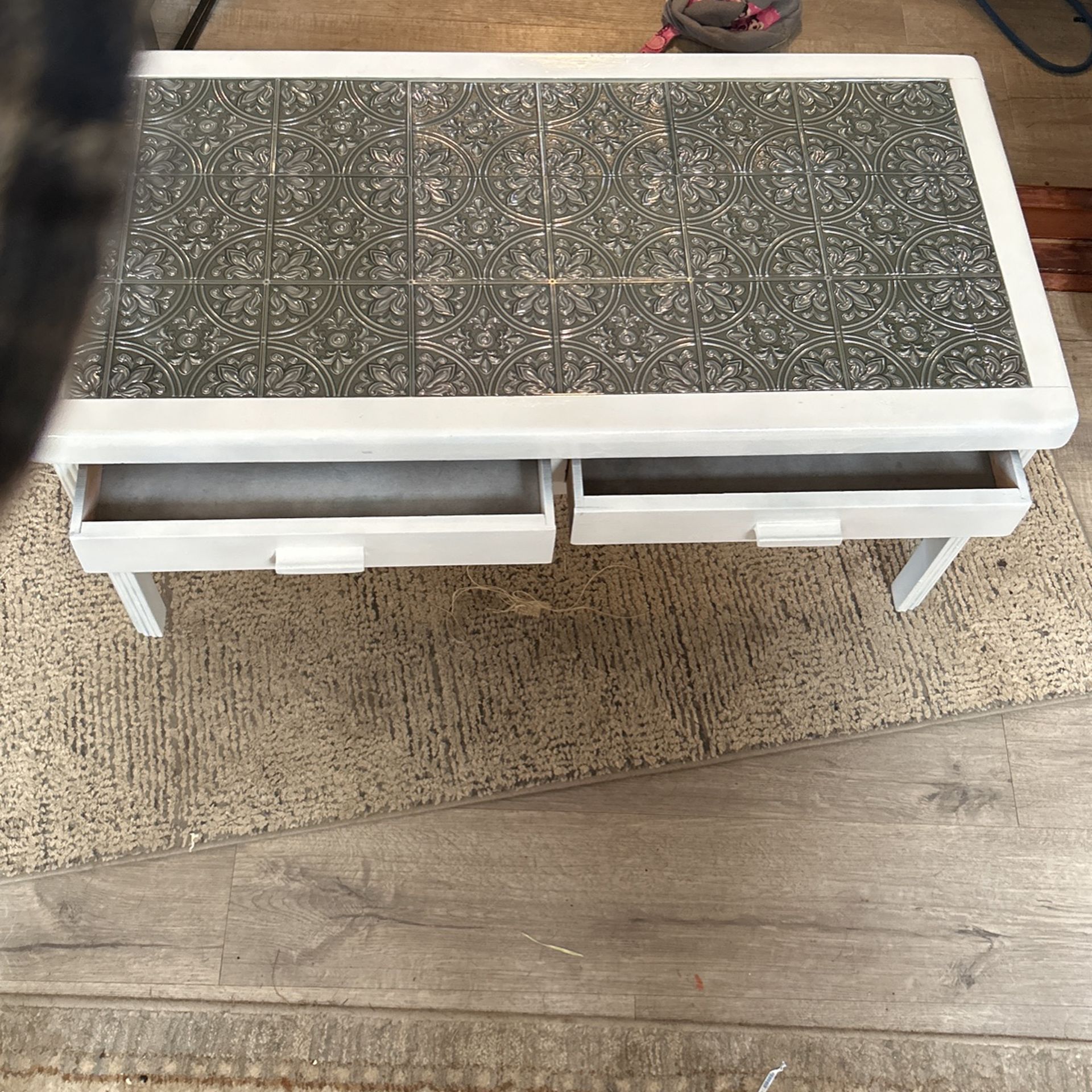 This is a vintage Selwood coffee table with two little drawers in the front. It has an inlay in the center, which is newly rehabbed with resin. Very cute for indoors or your patio.