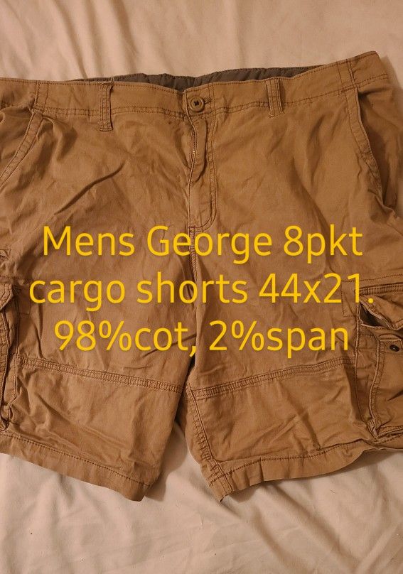 Mens George khaki twill cargo shorts 44x21, 8 pocket, 98% cot 2% span. East, west, north