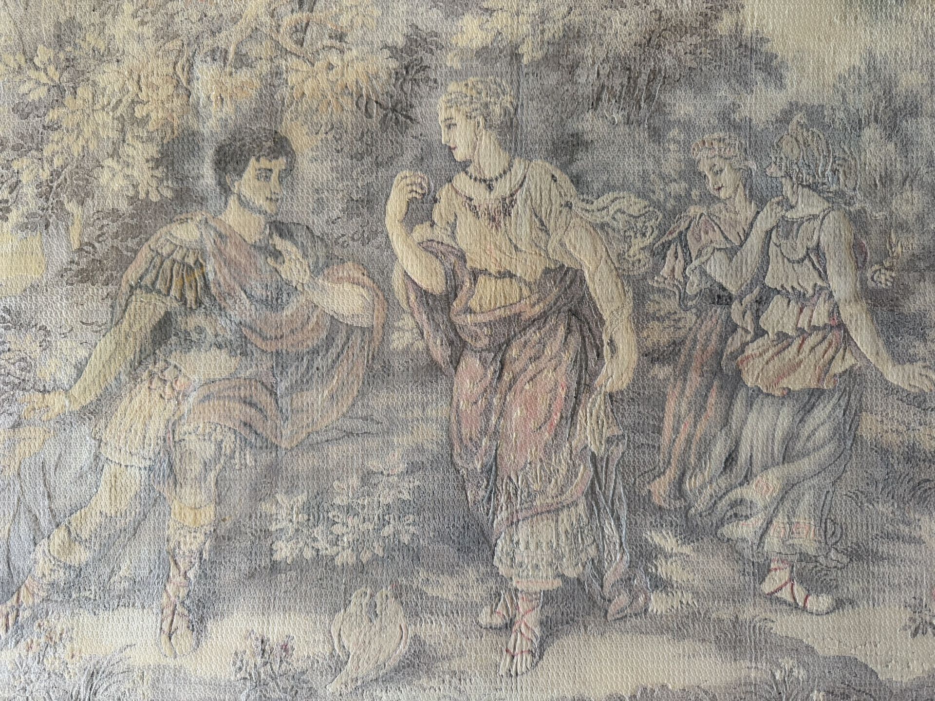 Glazed and hand painted and washed in pastel topcoat over antique French tapestry with Roman scene of love- doves and flowers scene - just hang or frame for the contemporary look - excellent art textile. Brought from South of France 65 years ago by my family- worth thousands of dollars at that time- yours for 65$ - pick up location Sunny isles 33160 COMES WITH THE GLASS 39inches by 25 - stretched over wood frame already.