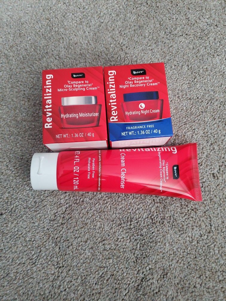 1.36 oz each compare to Olay Regenerist moisturizer & night cream (fragrance free) 4 FL oz cream cleanser Cleans exfoliates soothes