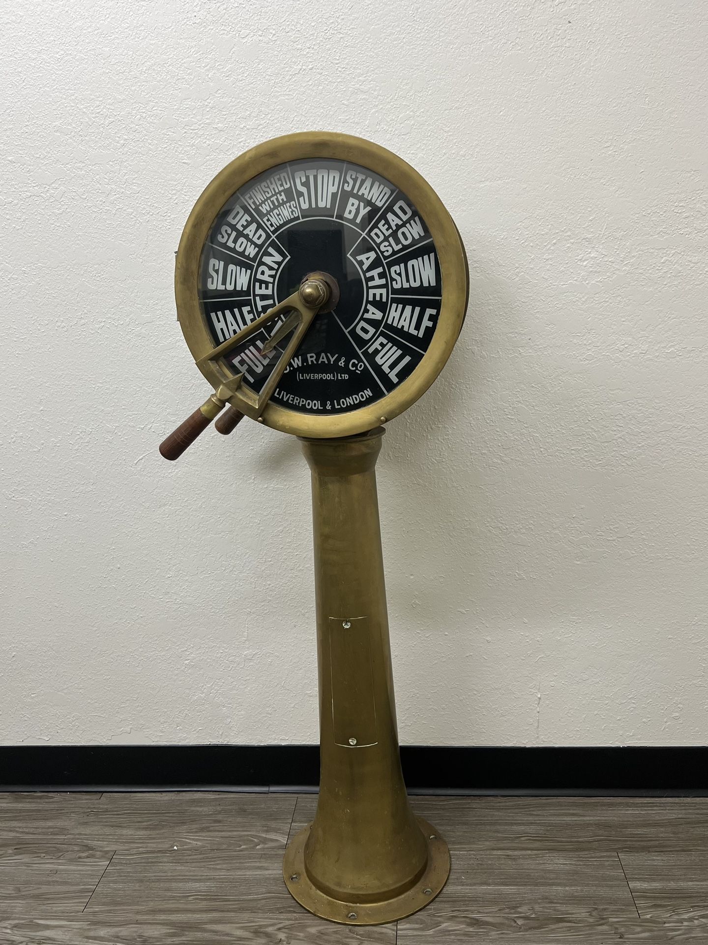 Solid brass bridge telegraph by JW Ray of Liverpool and London. Double black faceplates reading standard commands. Bells chime when handles are operated. Face diameter is 16". Overall height is 47" without handle x 9" deep. Weight is app 58 LBS Minor dent as circled in picture.