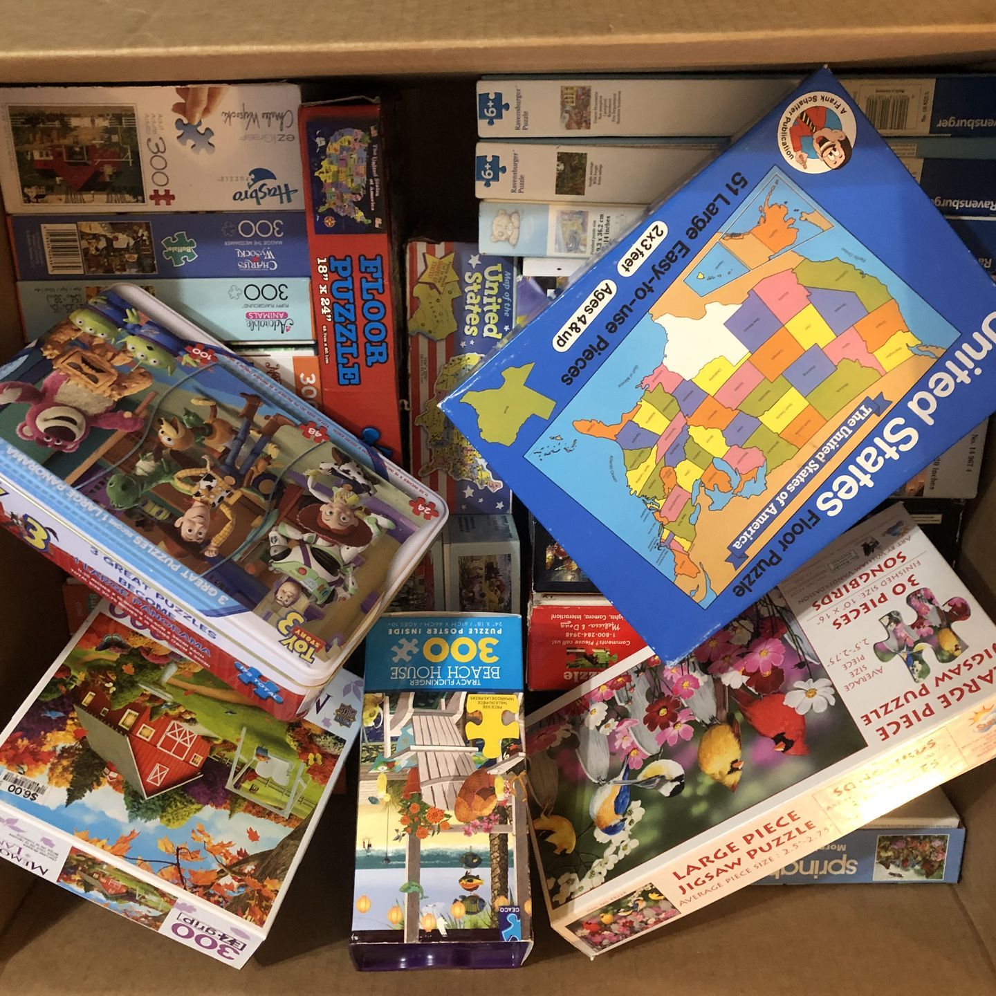 Big box of quality puzzles. 28 ranging from 100 to 500 pieces. Some large floor puzzles. Mostly easy grip 300 pieces. Complete Like new. Could help bring family and friends closer together. Get them off their electronic devices and help them interact with each other . For all ages